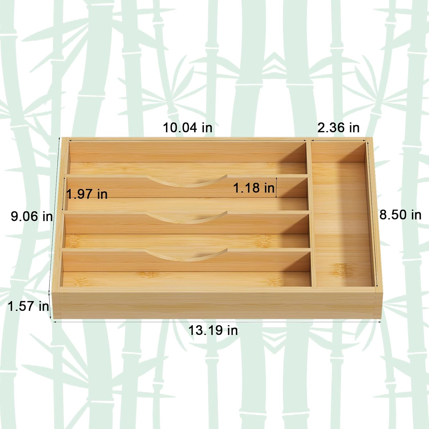 PREMIUM MATERIAL: Bamboo silverware organizer with 100%natural bamboo and sturdy MDF base will make sure that it lasts for ages in your home.Which is a renewable resource, elegant and durable.