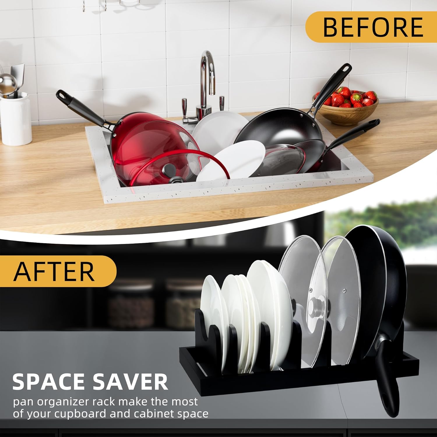 Widely Used and Stored: Use our pot racks to organize your pots, pans, cast iron, lids, trays and bakeware, it will help you save more cabinet and countertop space in the kitchen,very perfect pan organizer rack for cabinet
