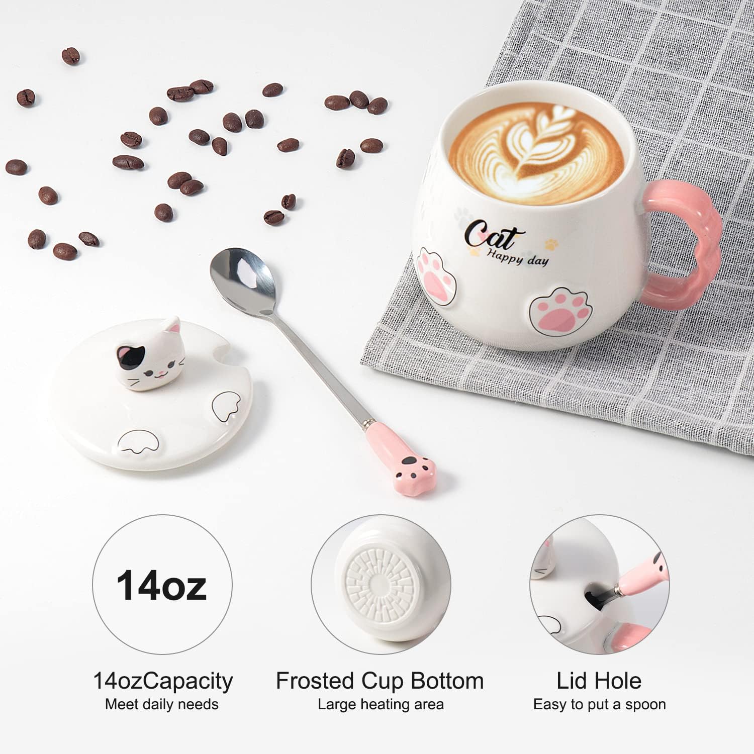 Special Flat Bottom Cat Mug :Cute Cat Mugs with flat bottom, Which makes the bottom fully fit the warmer heating plate, so this mug would stay hot to warm up the beverage inside,100% ceramic material
