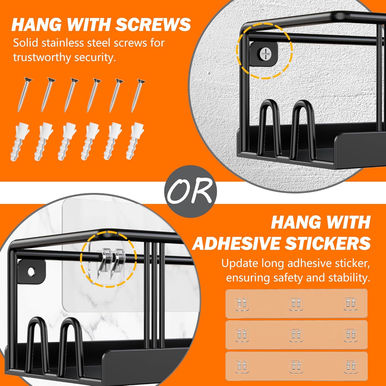 Two-Installation: Updated stainlsee steel screws offer a sturdy and secure finish, while wider adhesive hooks provide a drill-free option. Avoid using screws or adhesives on thin/hollow doors, painted walls, wood, wallpaper, or rough/uneven surfaces.