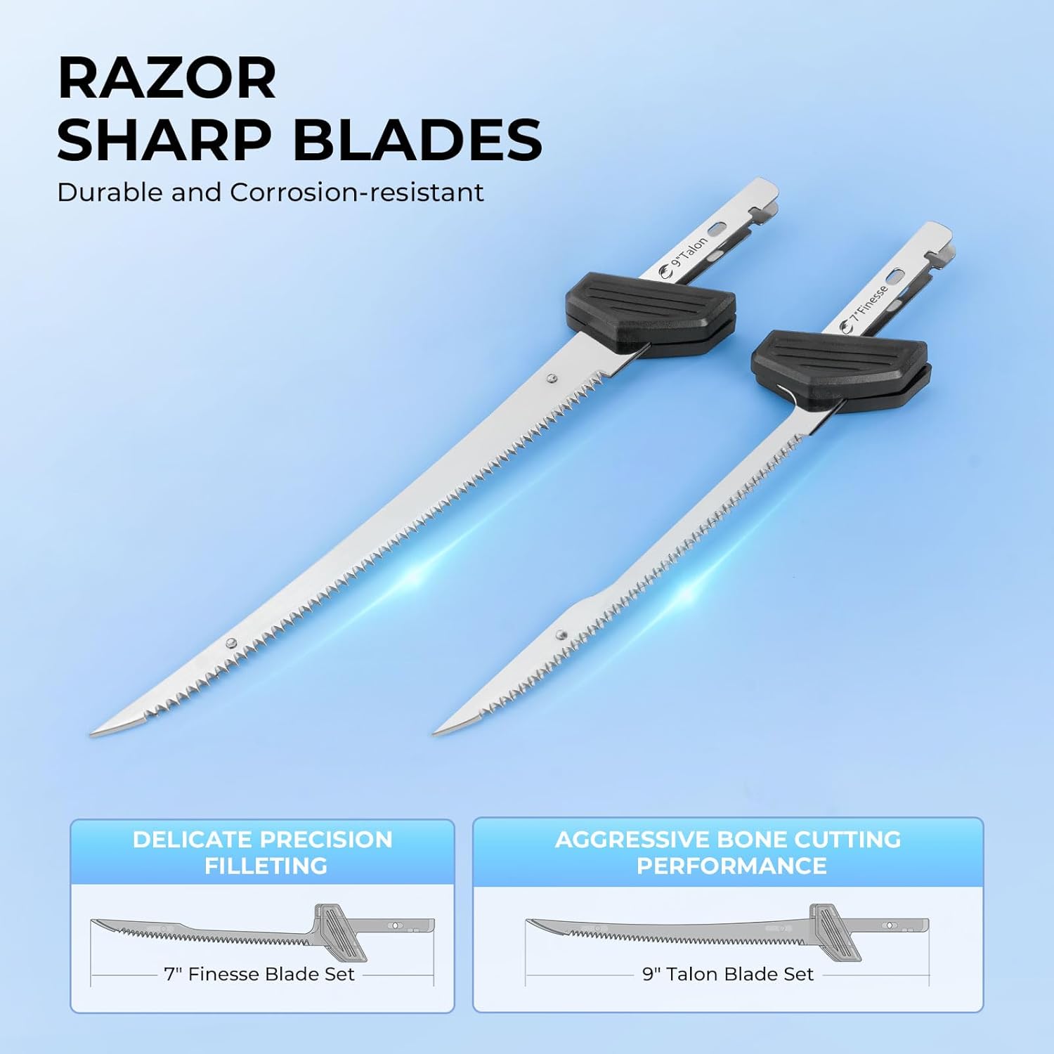 Premium Blades for Precision Filleting: The BladeVolt electric fishing knife includes two high-quality detachable stainless steel blades, a 7″ Finesse blade for precise everyday filleting and a 9″ Talon blade for larger cuts. Each filet knife blade is passivated and mirror polished to form a dense oxide layer that resists corrosion and withstands salt spray testing.