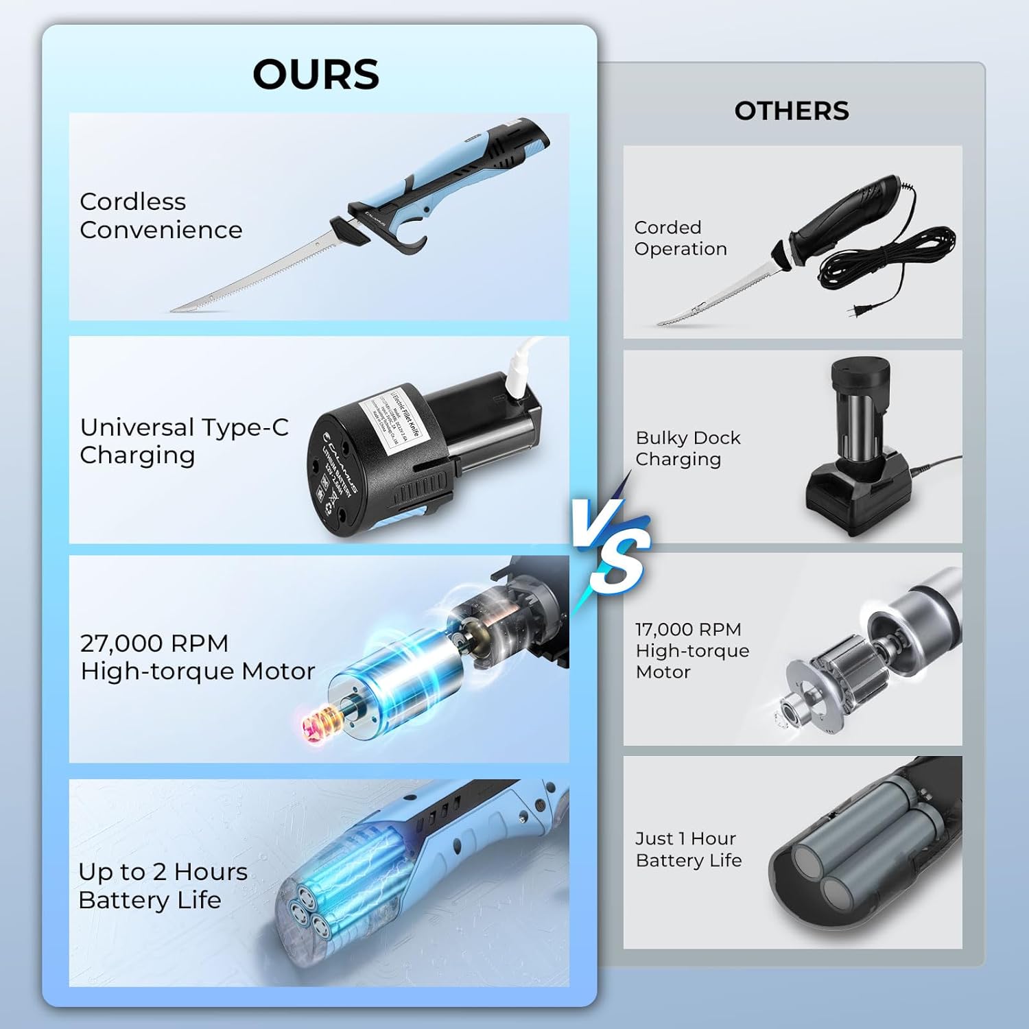 Long-lasting Battery & Type-C Charging: Powered by two 2600mAh lithium‑ion batteries, each offering up to 2 hours of runtime, this cordless fillet knife for fish ensures uninterrupted use. The included 3.3ft Type‑C cable allows easy charging from various sources, while built‑in NTC and PCBA temperature control provide reliable overheat protection, while a clear indicator shows remaining power levels in increments of 100%, 75%, 50%, and 25%.
