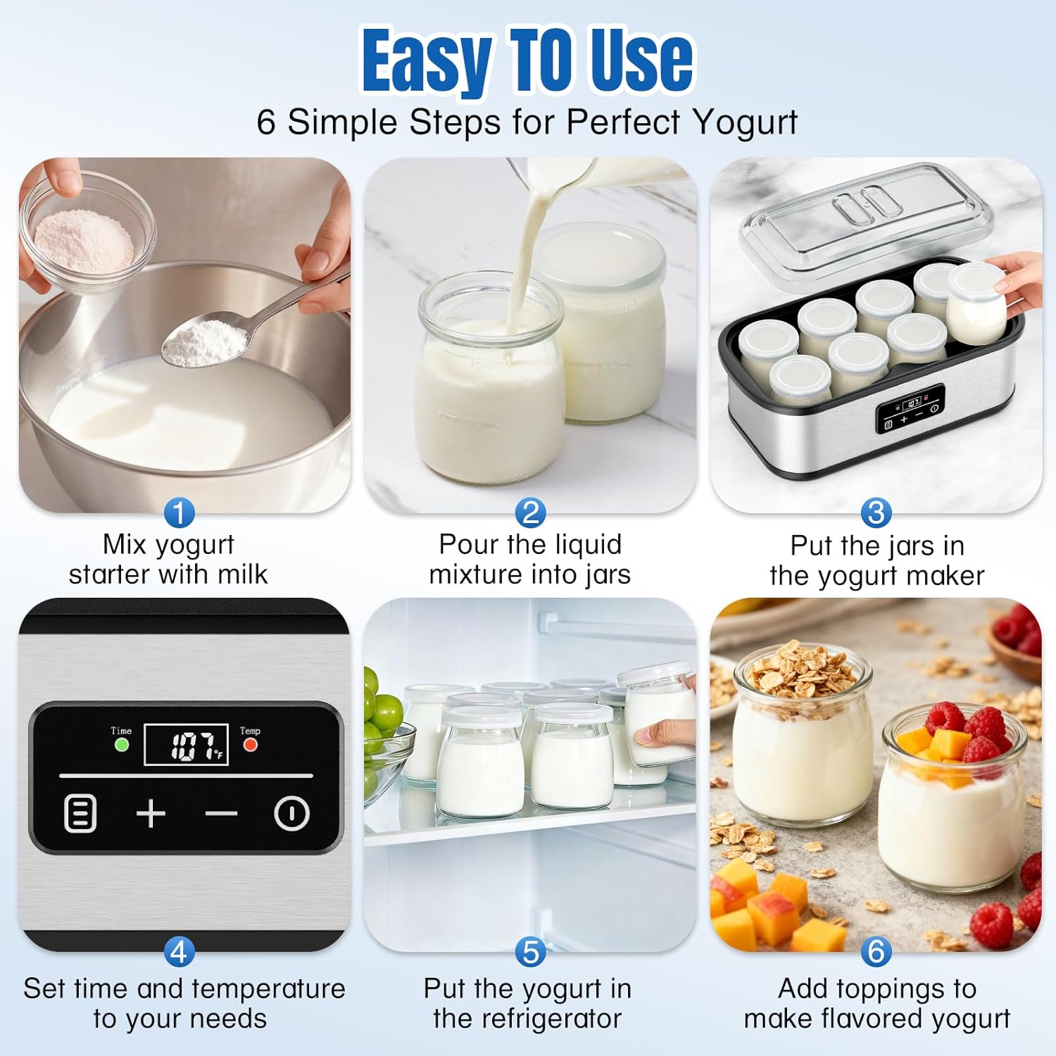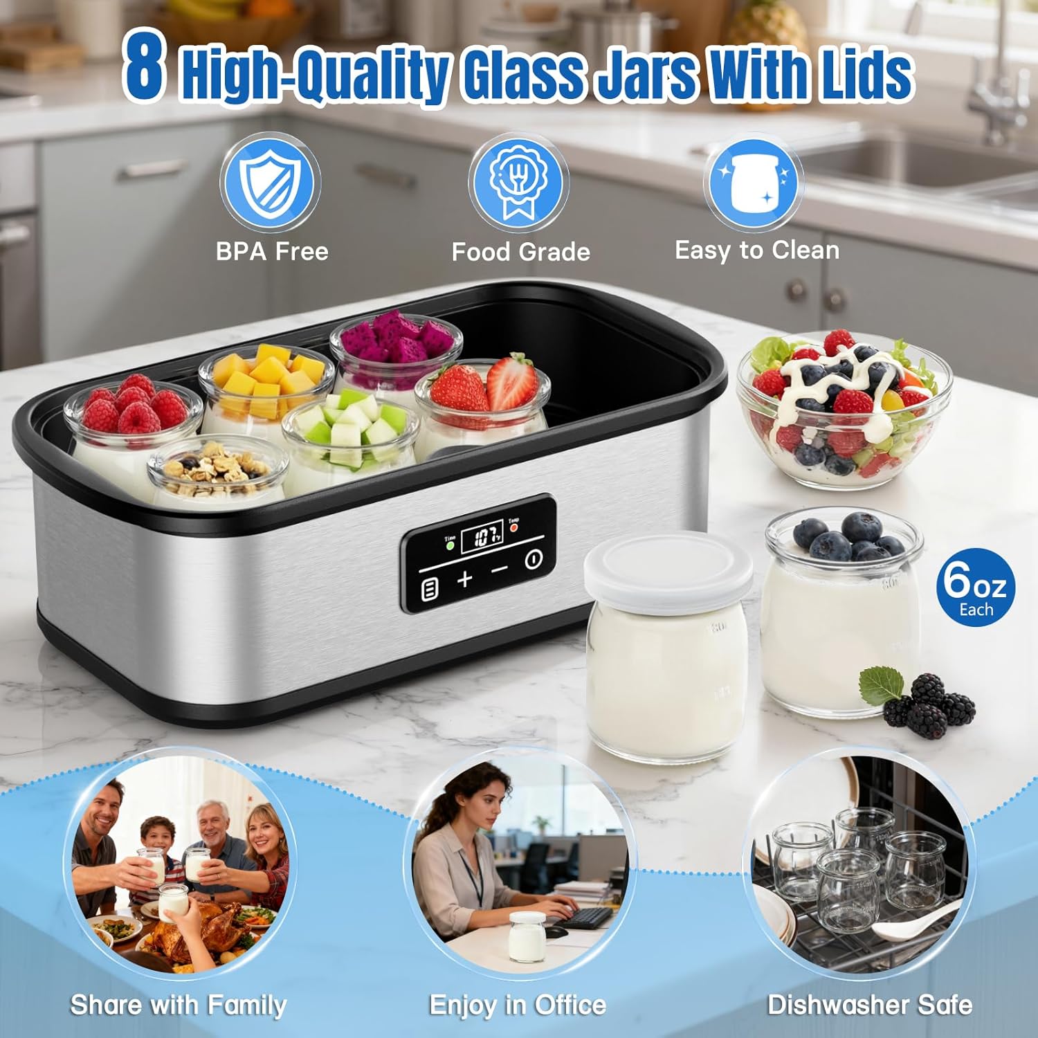 【Easy to Clean and Store】Cewajbaa probiotic yogurt maker comes with 8 independent 6oz glass jars, all equipped with BPA-free lids—safe, odorless, and effective at preventing contamination. Crafted from glass, the jars are easy to clean and can be directly placed in the dishwasher for time-saving convenience. The lid design excels at both storage and freshness preservation, letting you easily share the deliciousness with family and friends.