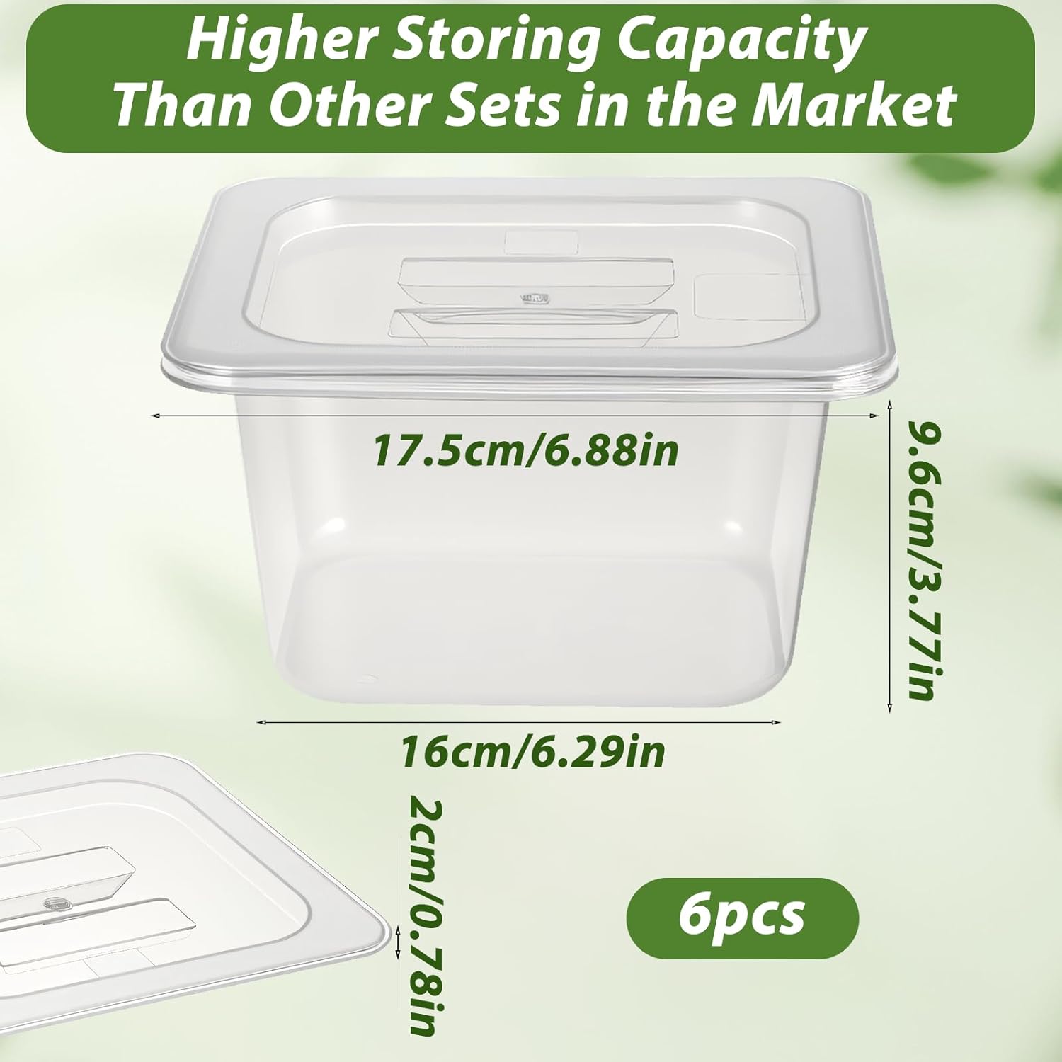 Snack Containers: Each 1/6 size plastic food pan measures 6.9 x 6.3 x 4 inches and has a 1.5 quart capacity, making it perfect for storing snacks, fruits, salads, and more while optimizing kitchen space.