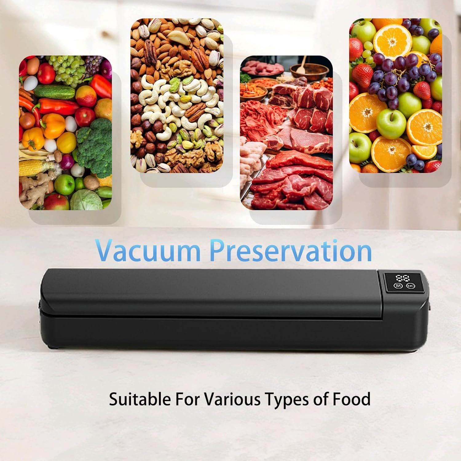 Suitable for All Foods: Ideal for seafood, meat, fruits, vegetables, nuts, snacks, and more, it effectively seals both wet and dry foods for long-term storage.