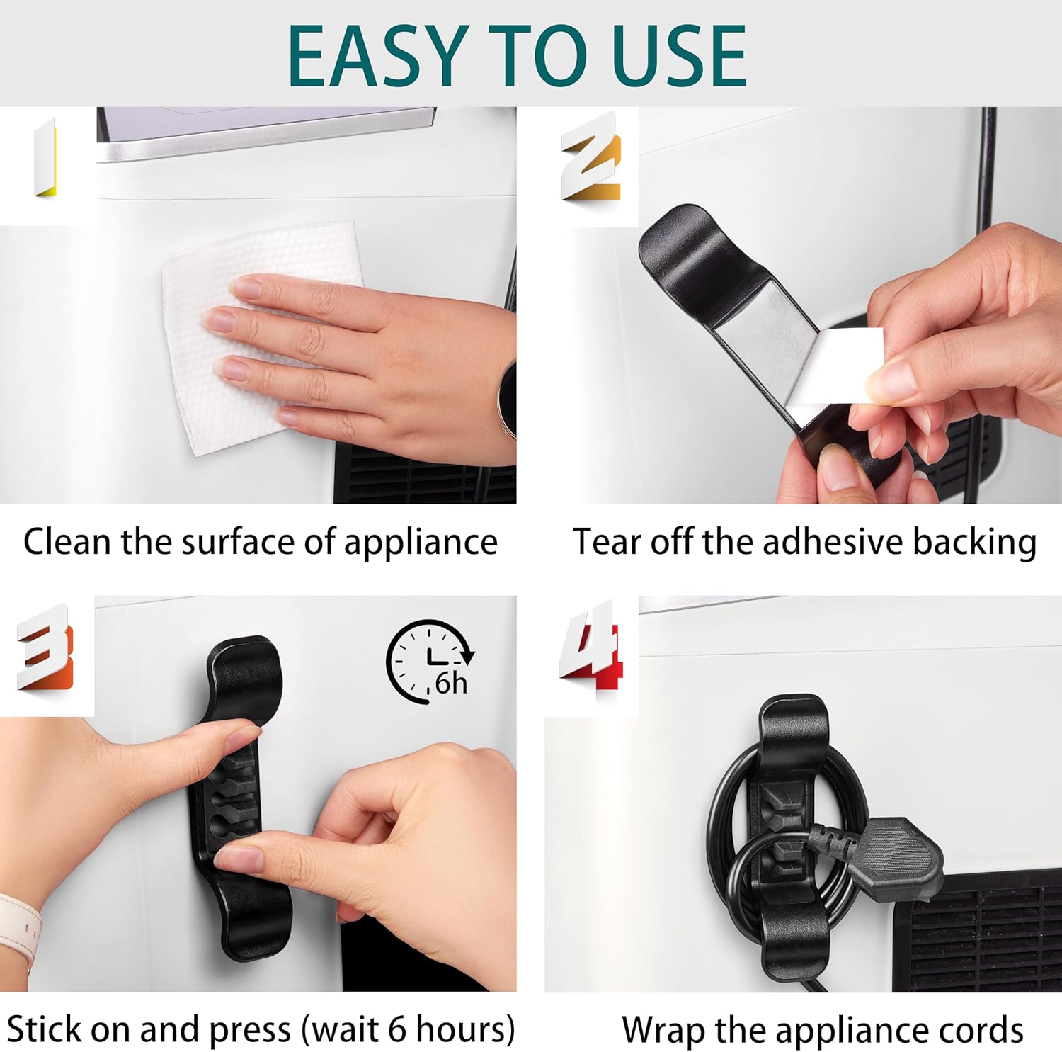 PREMIUM MATERIAL: Each appliance cord organizer stick on is made of high quality rubber, durable and deformation resistant. The sticky adhesive pad is non-toxic, odorless, and will not leave marks on kitchen appliance surface