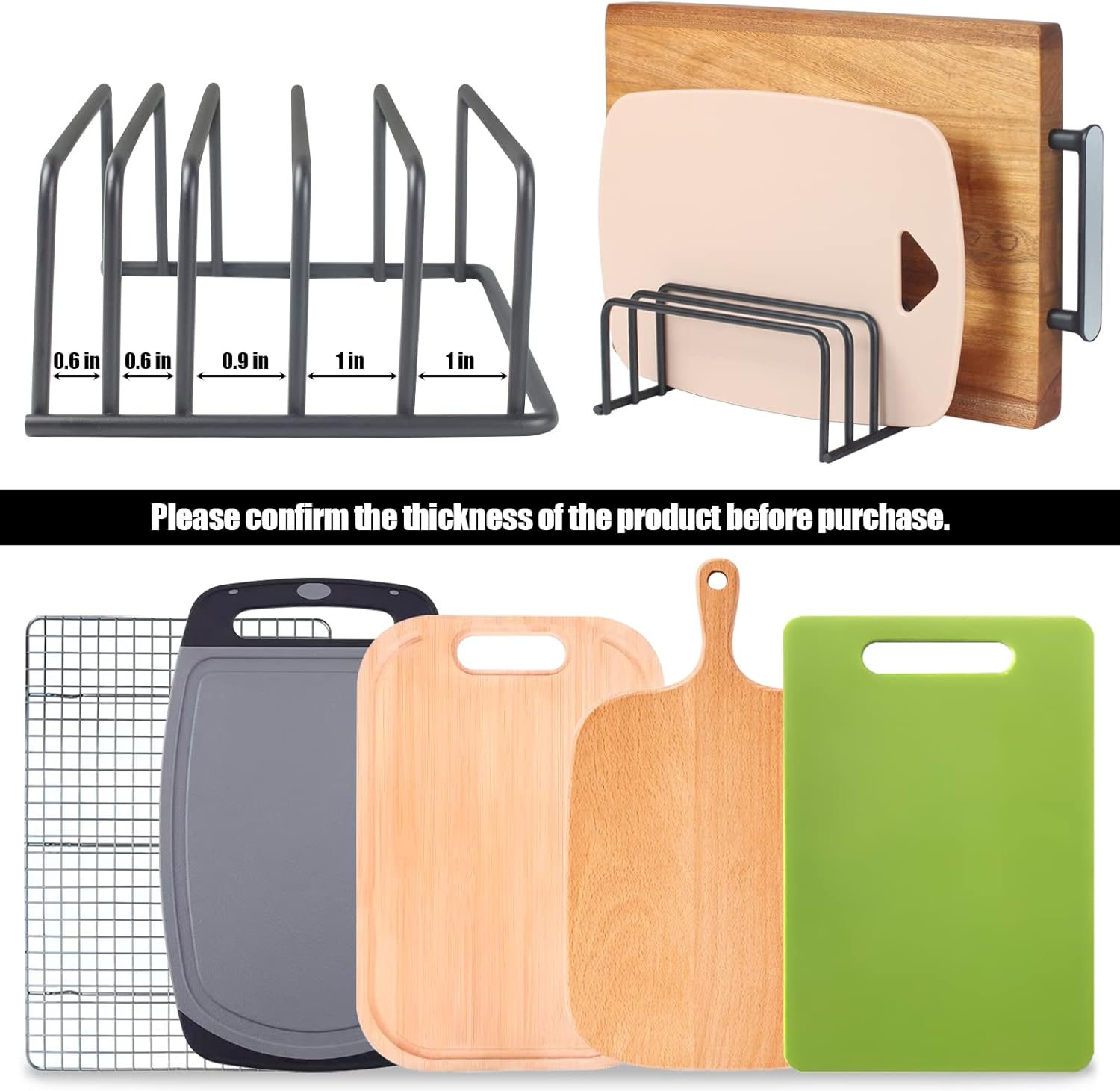 COMPACT AND CONVENIENT: Our Cutting board organizers are 7.2×5. 8 x 3 inches with three dividers 1 inch wide and two dividers 0.6 inches wide. The rack accommodates cutting boards or plates up to 0.6-1 inch wide.