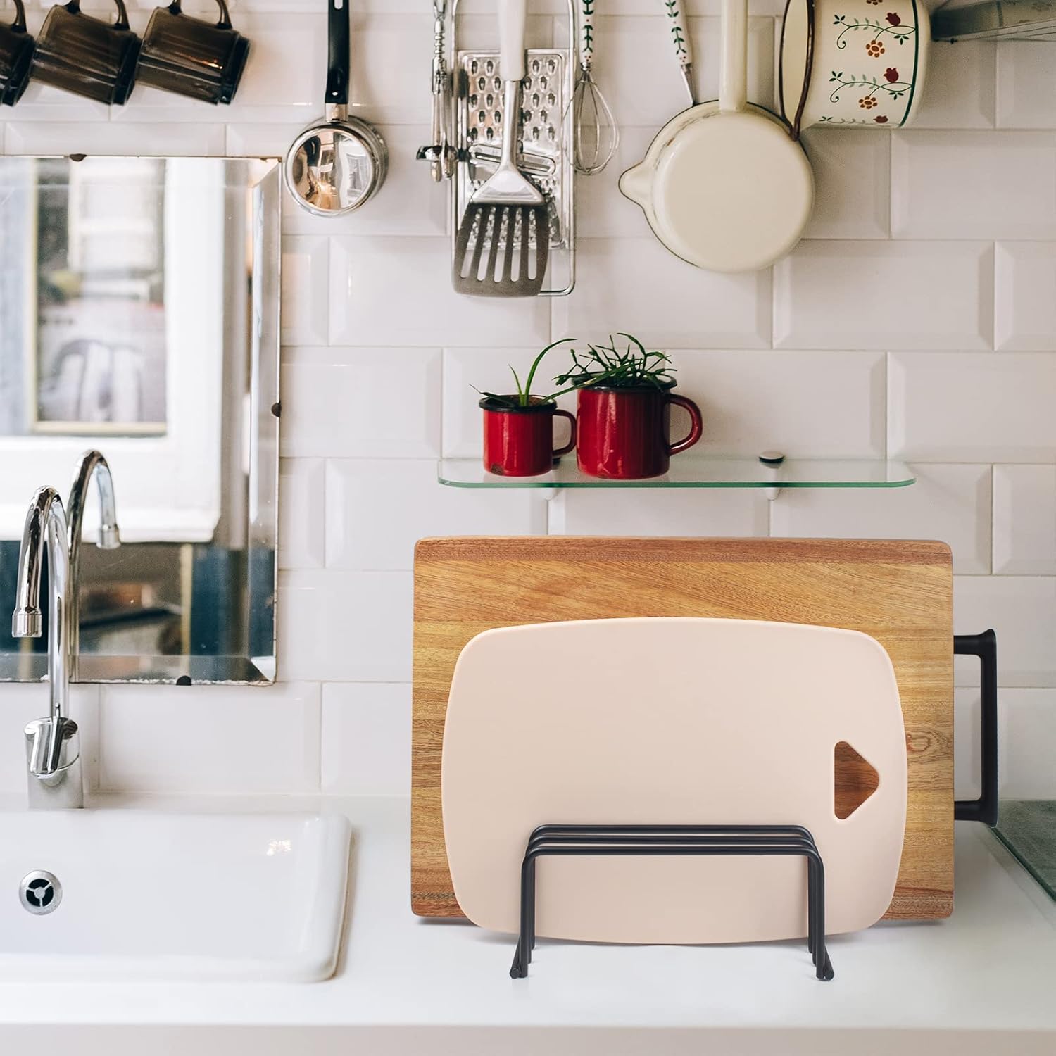 - Cutting board holder is flexible: you can use it to store cutting boards, chopping boards, plates for kitchen essentials, cookie sheets, and recipes, etc. It holds items securely and keeps them organized.