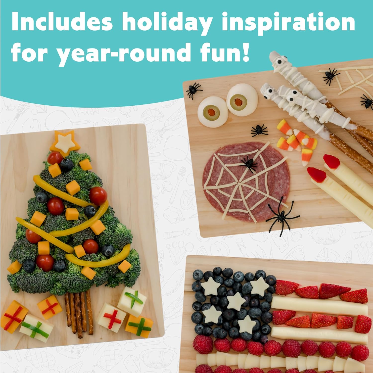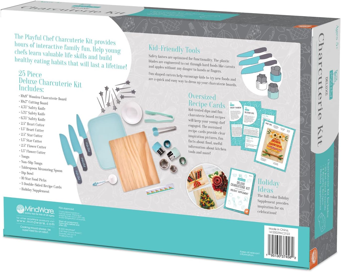 Includes: Wooden charcuterie board, cutting board, 3 safety knives, 6 shaped cutters, tongs, measuring spoons, bowl, food picks, oversized recipe cards a pamphlet with ideas for holiday-themed trays