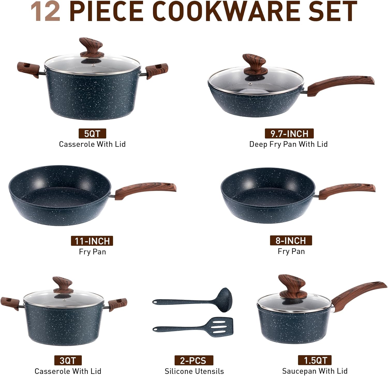๐Ÿ๐Ÿ ๐๐ข๐ž๐œ๐ž ๐†๐ซ๐š๐ง๐ข๐ญ๐ž ๐‚๐จ๐จ๐ค๐ฐ๐š๐ซ๐ž ๐’๐ž๐ญ ๐ˆ๐ง๐œ๐ฅ๐ฎ๐๐ž๐ฌ: 8-inch fry pan / 11-inch fry pan / 9.7-inch Deep Fry Pan with lid / 1.5Q saucepan with lid / 3Q casserole with lid / 5Q casserole with lid / 2 pcs silicone utensils. Different size of non stick pots and pans set meets all your need for daily cooking