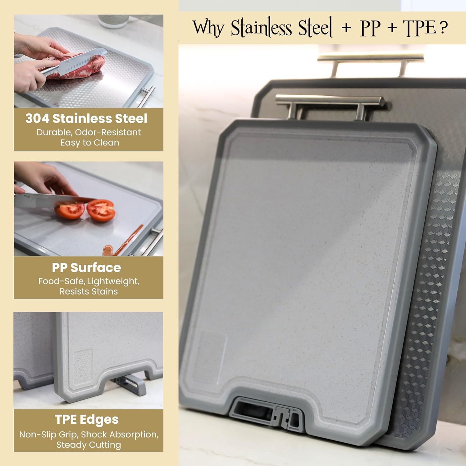 Stable, Mess-Controlled Cutting Surface: Non-slip edges grip your countertop so this steel cutting board stays put when you are breaking down poultry or chopping dense veggies; a deep juice groove around the PP side captures meat and fruit drips, helping your stainless steel chopping board keep prep tidy and organized.