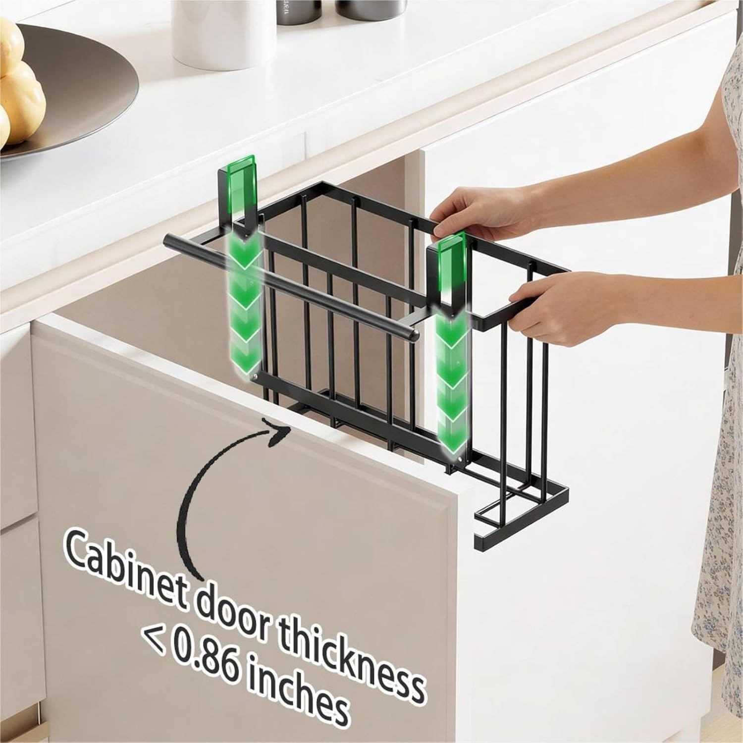 2-in-1 Hanging Basket & Towel Rack:This over the cabinet door organizer with towel bars clever combo features a top towel bar for hanging cloths and a bottom basket to store kitchen essentials like cleaning supplies, bottles, and paper towels — freeing up counter space while maximizing storage efficiency.