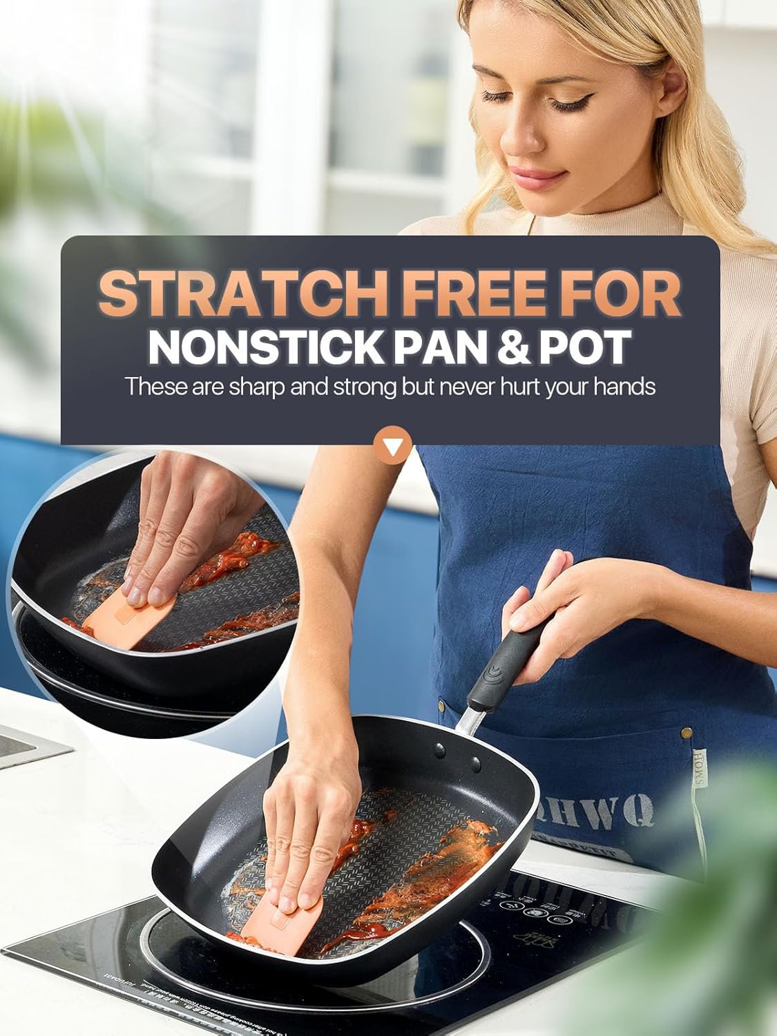Food Grade Materials : Containing no BPA, the pot scrapers are made by food-graded plastic which is non-toxic, odorless and environmental; with better resistance to high temperature up to 280F°, the plastic pan scrapers tool can bath in the boiling water; the non-stick surface is easy to clean