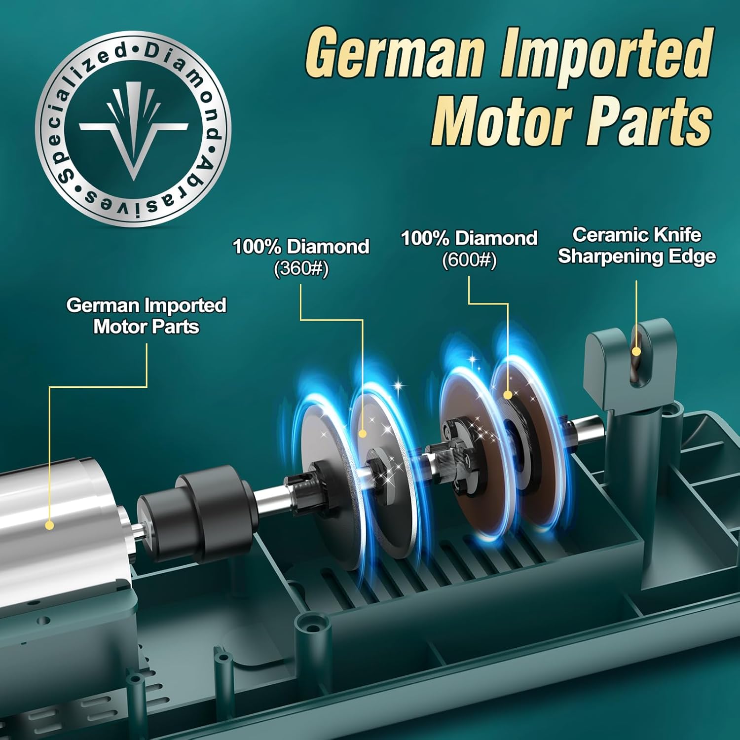 High enhanced stability: Featuring a motor with advanced German technology DC motor, this knife sharpener offers a stable and continuous working condition for over an hour, allowing you to sharpen all your knives at once without the risk of overheating. Its 110-120V wide voltage design ensures compatibility with power systems North American State Area.