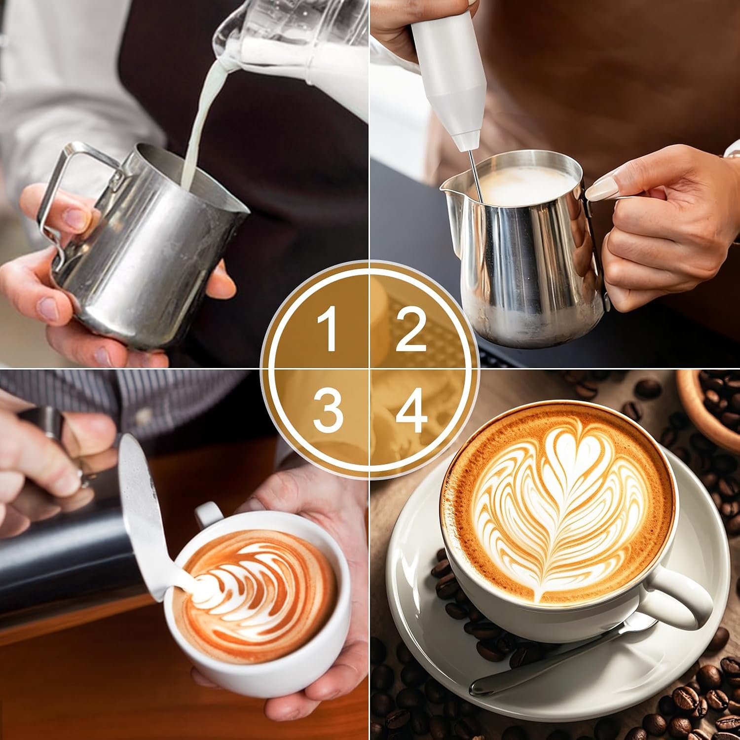 Electric frother the 3 speeds helped you master the perfect froth for lattes. The stainless steel whisks are sturdy, and the milk jug is the perfect size to avoid spills. Recharging is simple, and it looks sleek in my kitchen.