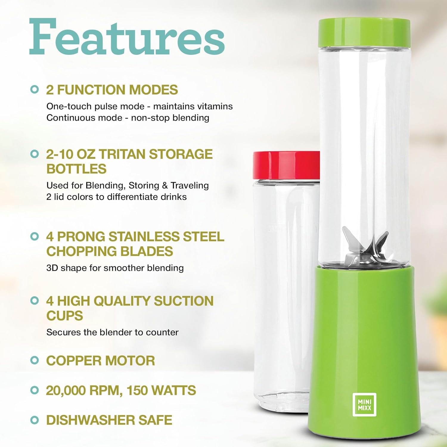 Advanced Blending Power – Experience efficient blending with a 150-watt, 20,000 RPM copper motor and durable 4-prong stainless steel blades in a 3D shape for superior mixing. It offers two function modes: one-touch pulse and continuous blending