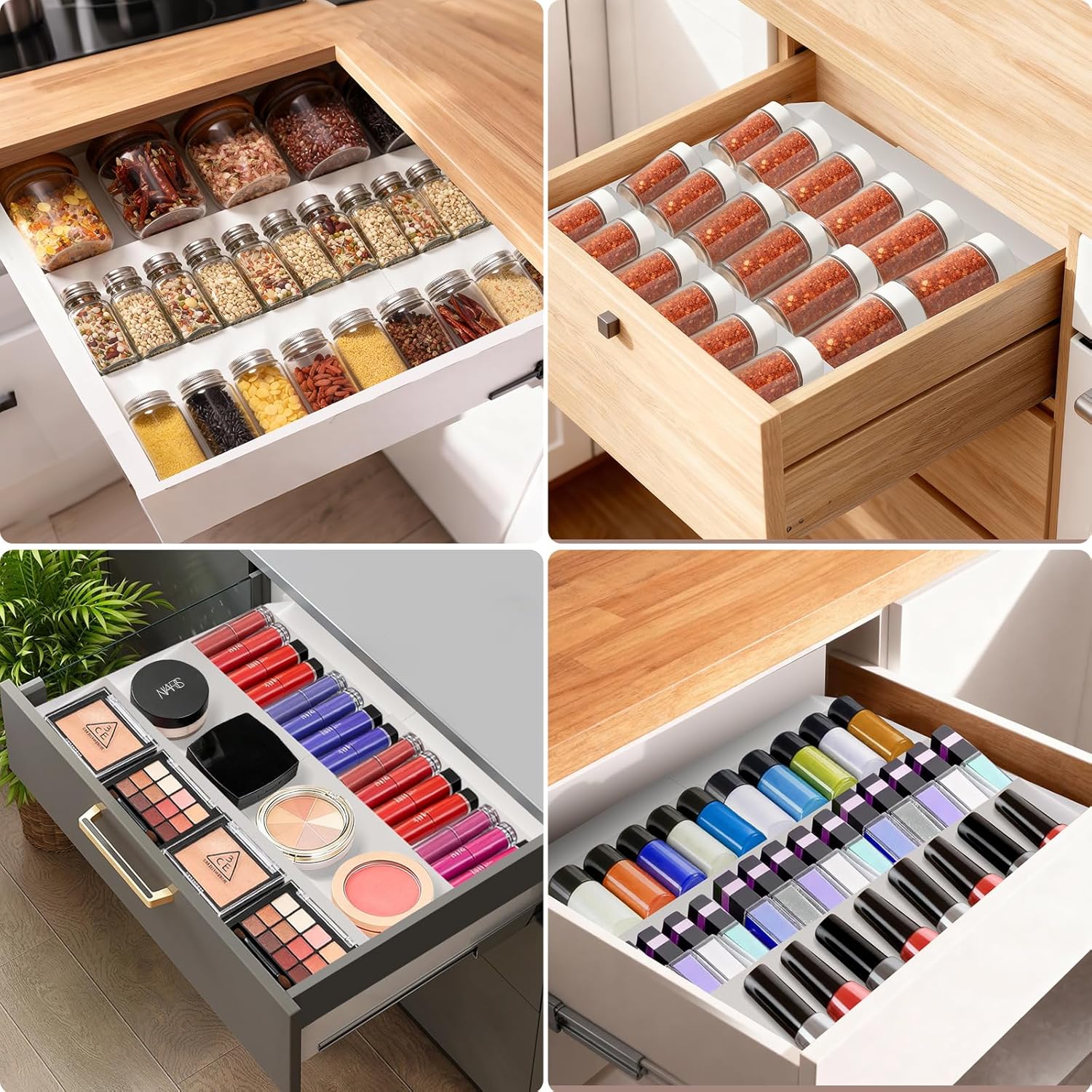 Non-Slip Stability: Our spice organizer for drawer comes with bonus double-sided adhesive strips that secure the organizer in place, preventing it from sliding around inside your drawer—stable, safe, and drawer-friendly