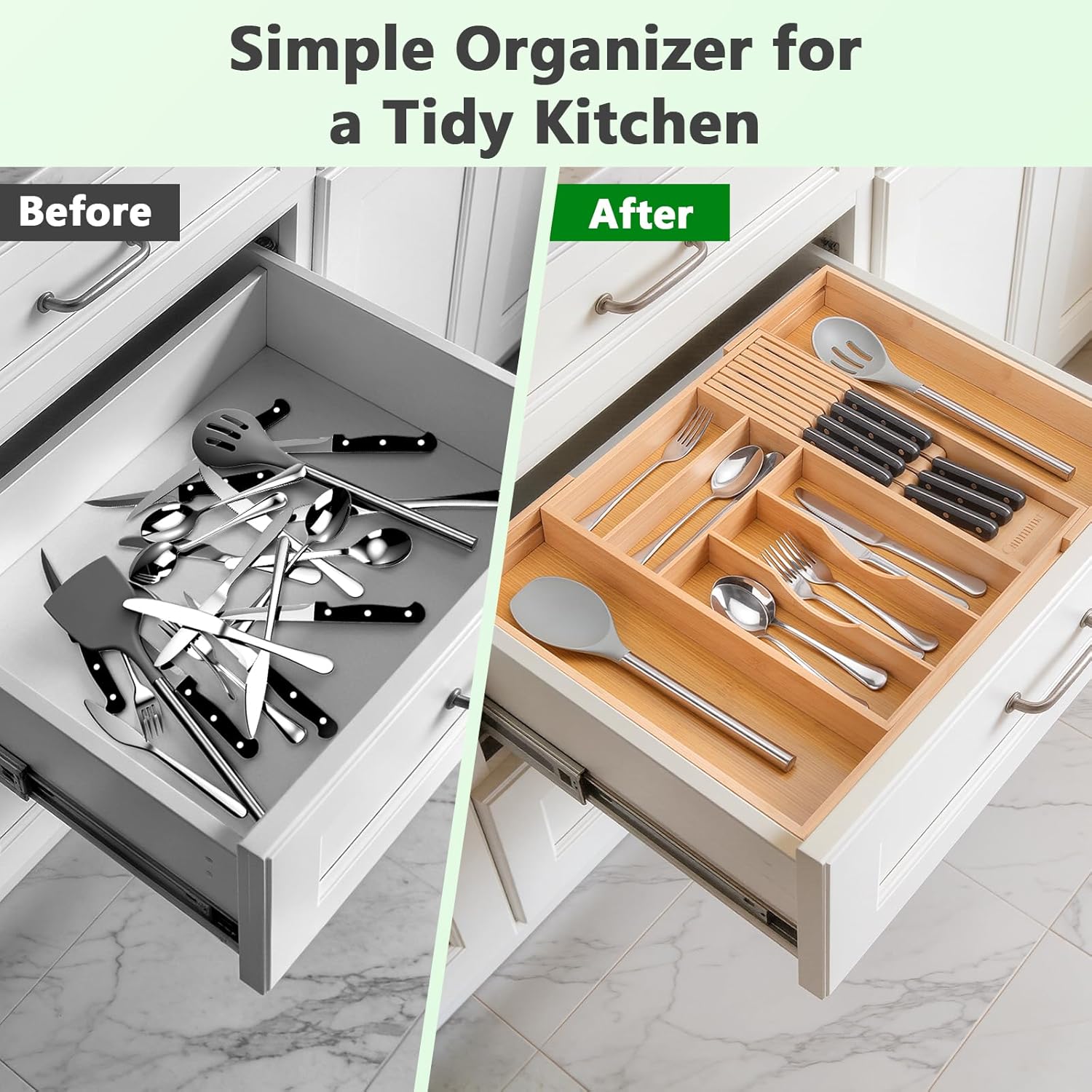 【Enhanced Compartments】:Designed with multiple dedicated compartments, this bamboo drawer organizer provides meticulous storage to keep your kitchen utensils, office supplies, or personal jewelry neatly sorted and right at your fingertips