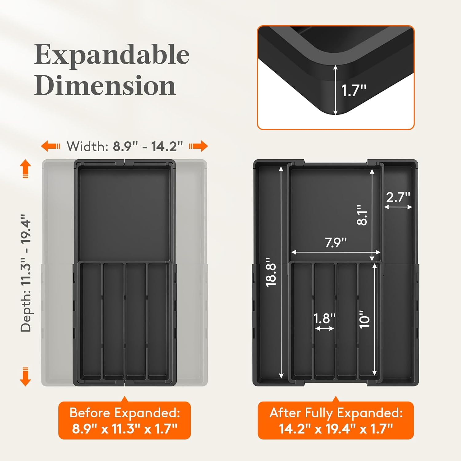 Bi-directional Adjustment: Our patented silverware organizer redefines drawer storage with a unique bi-directional adjustment system. Expand the width from 8.9 to 14.2 in and the depth from 11.3 to 19.4 in (1.7 in height). (Crucial: Measure your drawer – min. 8.9 in W x 11.3 in required)