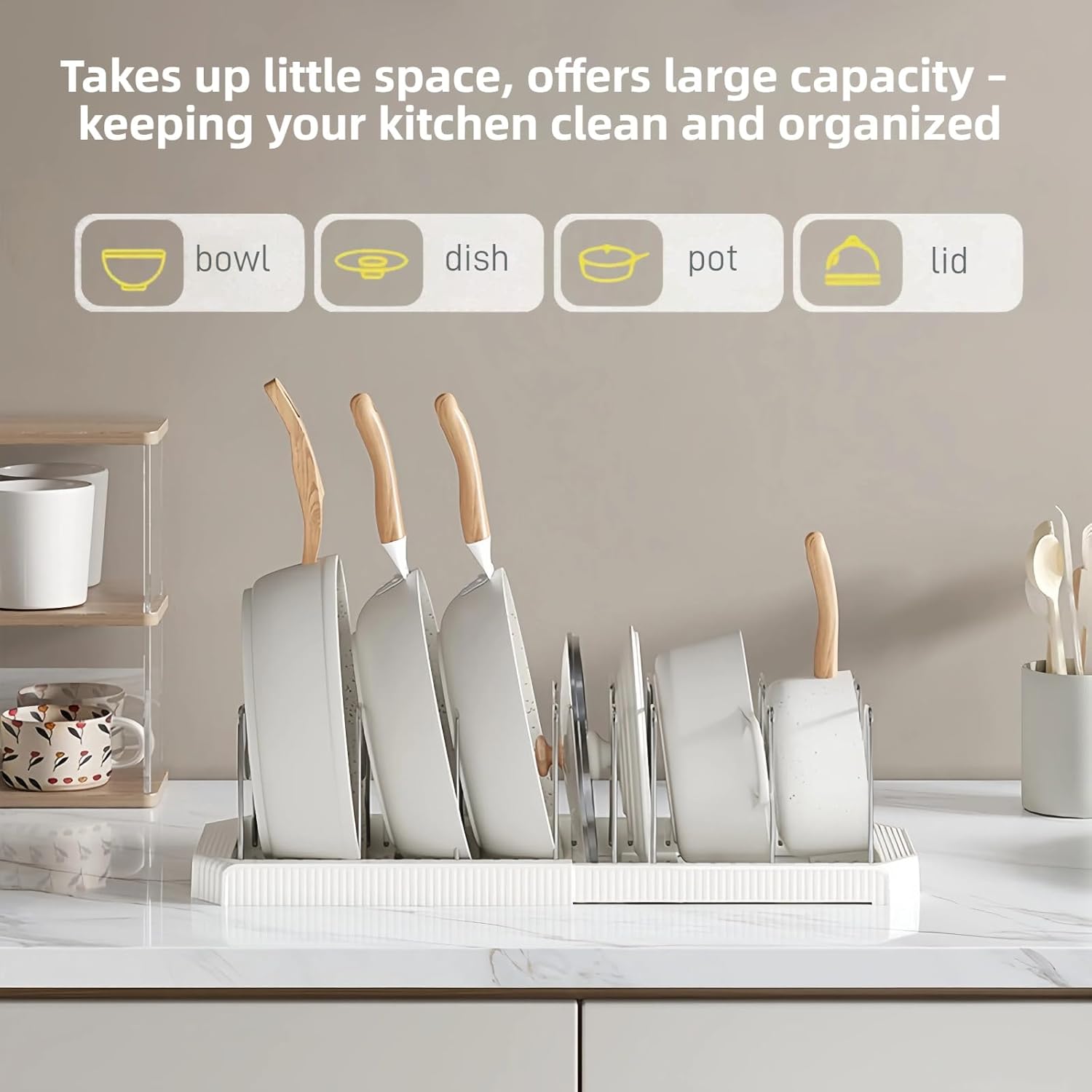 Easy for installation:Without any tools, just stretch the base of the pot lid organizer for cabinet to the appropriate length and insert the dividers into the grooves.It can be easily assembled in a few minutes.Heightened bottom design for smooth placement on surfaces