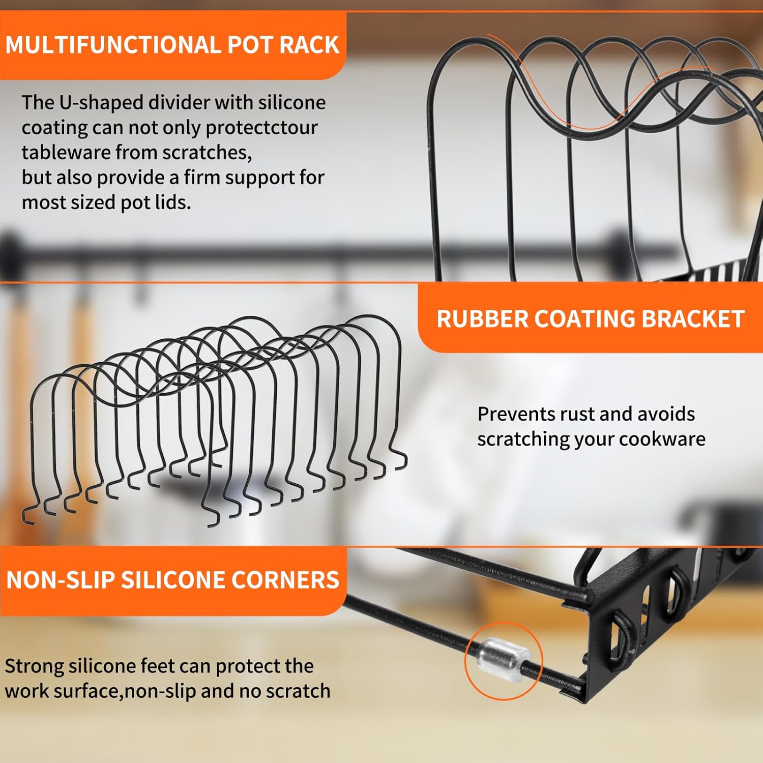 3.High-quality material: pot and pan organizer is made of heavy-duty iron, durable and rust-proof material, pan organizers inside cabinet can not only provide stable support for heavy pots to prevent deformation, but also prevent rust, pots and pans organizer under cabinet is extremely sturdy and durable.