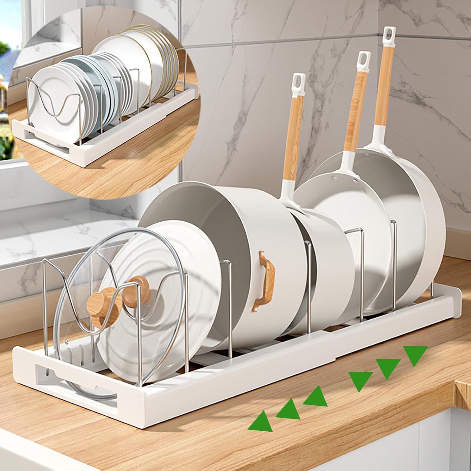 Easy to install by hand,without any tools; you can stretch the appropriate length of pan organizer rack and insert the dividers into the grooves according to the size of your pots and pans