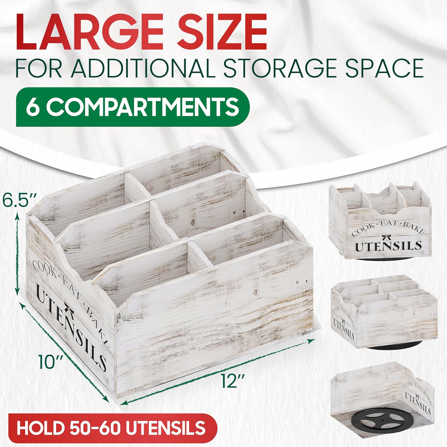 With a 360-degree rotating base, this storage rack allows you to rotate it for quicker and easier access to tools.Impressive dimensions of up to 12 L x 10 W x 6.5 H inches and 6 compartments to store up to 50-60 utensilsDessigned to hold spatulas, ladles, spoons, whisks, tongs, forks, knives, skimmers, peelers, corkscrews, and chopsticks.Packing Included: 1 x Extra Large Kitchen Utensil Holder vv