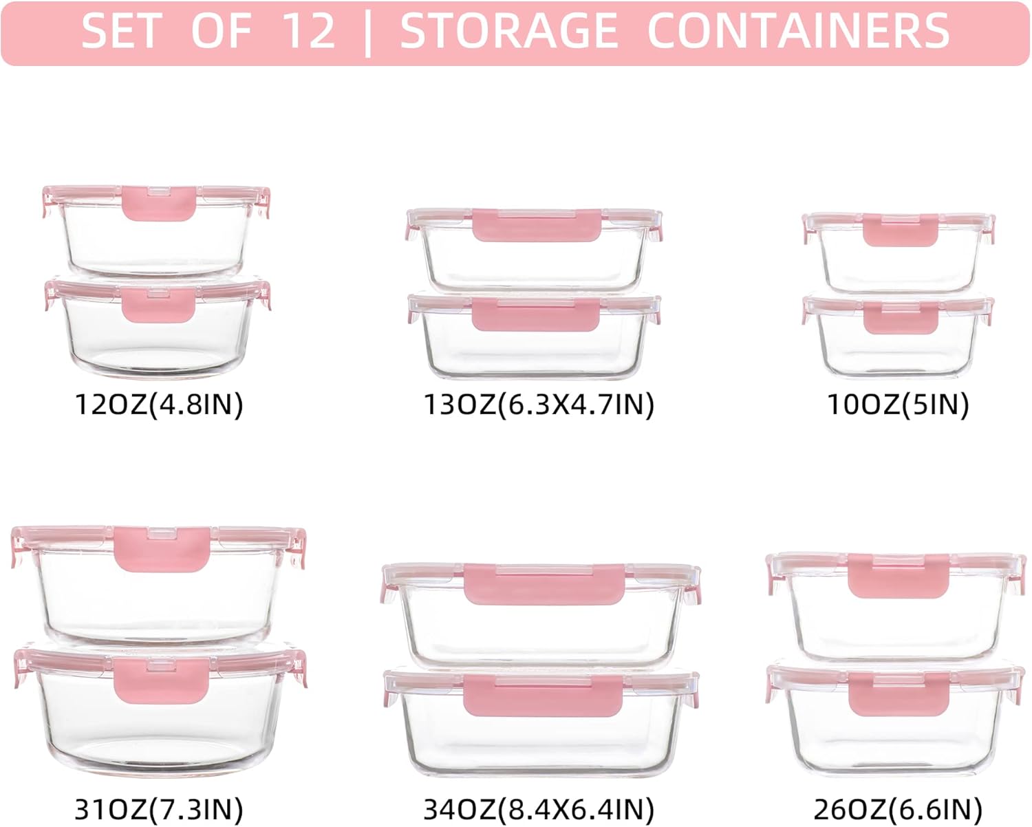 Comes with 12 borosilicate glass containers in 3 sizes and shapes along with 12 airtight lids to keep food fresh
