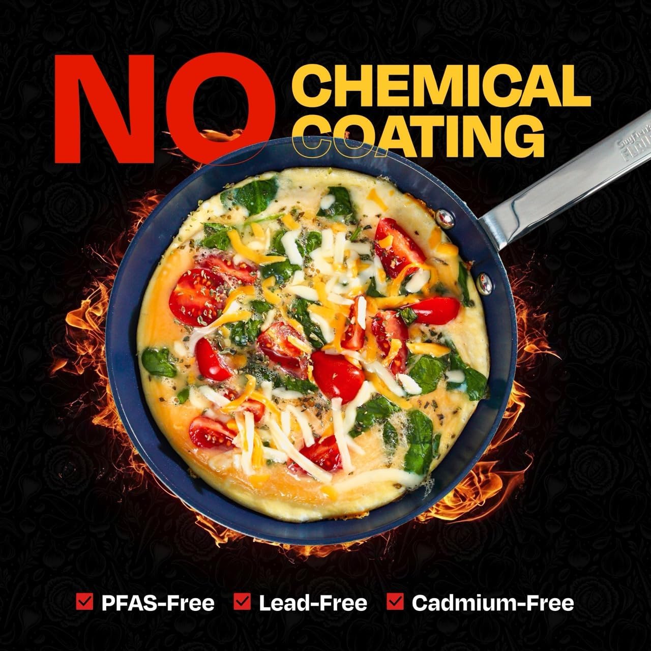 HEALTHY COOKING, FLAVORTOWN STYLE: This ceramic cookware set is made without intentionally added PFAS, PTFE, PFOA, lead, or cadmium. Clean, green, & built to cook lean. Ideal for anyone looking for nonstick pots & pans that go easy on you and the planet.