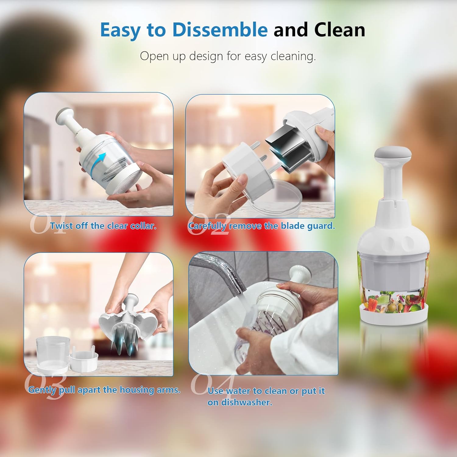 【Easy to Clean and Store.】The handheld vegetable chopper is easy to disassemble for speedy cleanup. You need to disassemble the food chopper before cleaning. Just hold the mid-section of the food chopper and twist off the clear collar, carefully remove the blade guard, and gently pull apart the housing arms. Then, simply cleaning the food chopper under running water in 2 minutes and store, also top dishwasher safe.