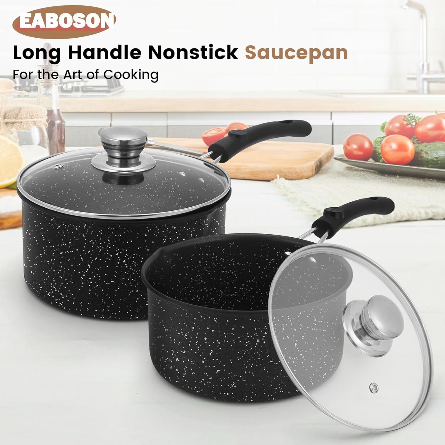 【Ergonomic Handle & Glass Lid Design】 The saucepan set is built for your convenience and safety. The long, comfortable handle stays cool on the stovetop and provides a secure, firm grip. Coupled with the heat-resistant glass lid that locks in flavor and nutrients, it allows for easy monitoring without lifting the lid, promoting healthier and tastier meals.