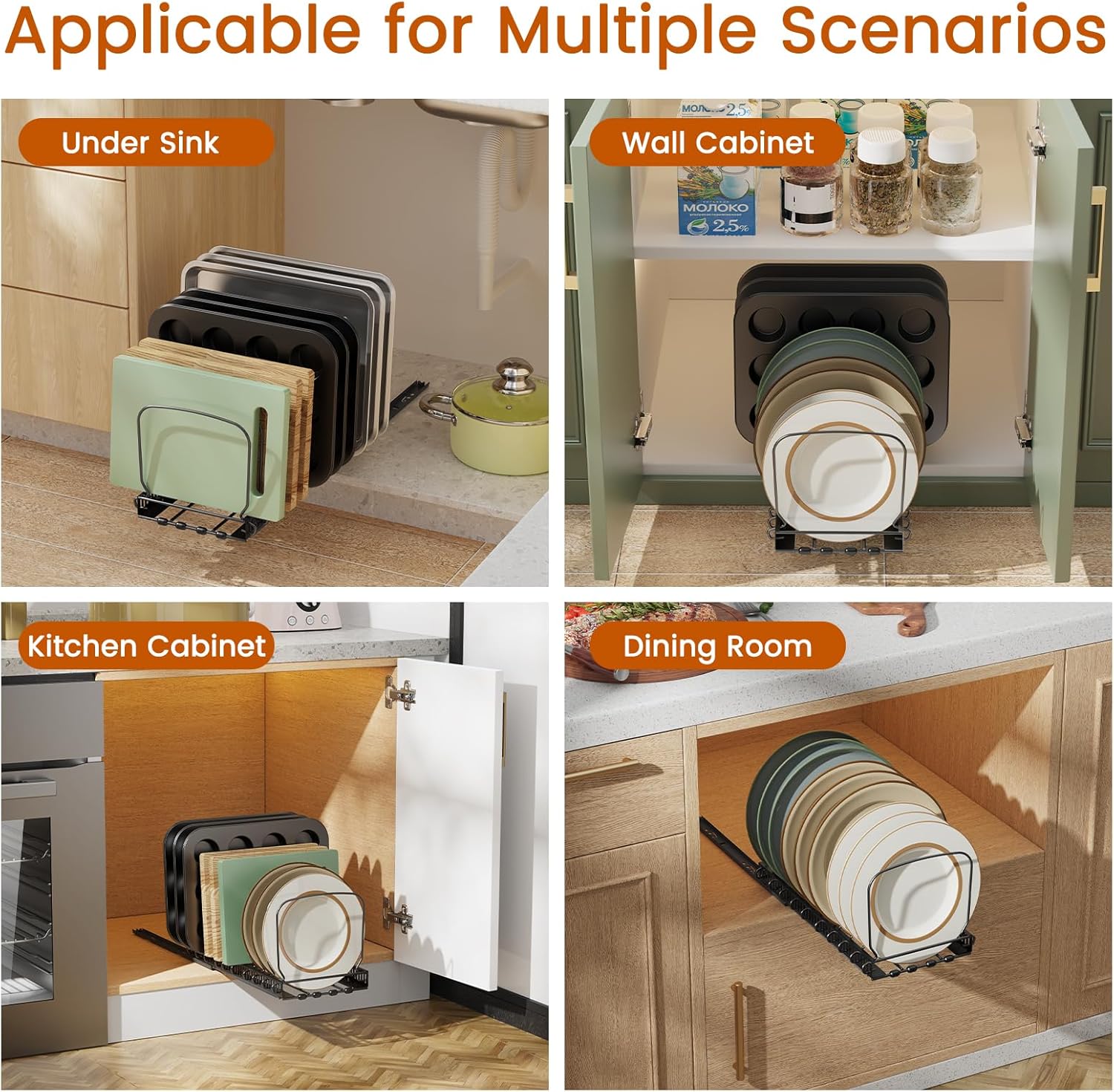 【Easy to Hold or Store】 Easy access with a gentle pull. Slide-out baking sheet rack holder neatly organizes frying pans, baking sheets, baking utensils, cutting boards, plates, and so on. Ideal for use in kitchen cabinets, wall cabinets, under sinks, etc. Within easy reach, say goodbye to bending over or getting down on the floor to find items.