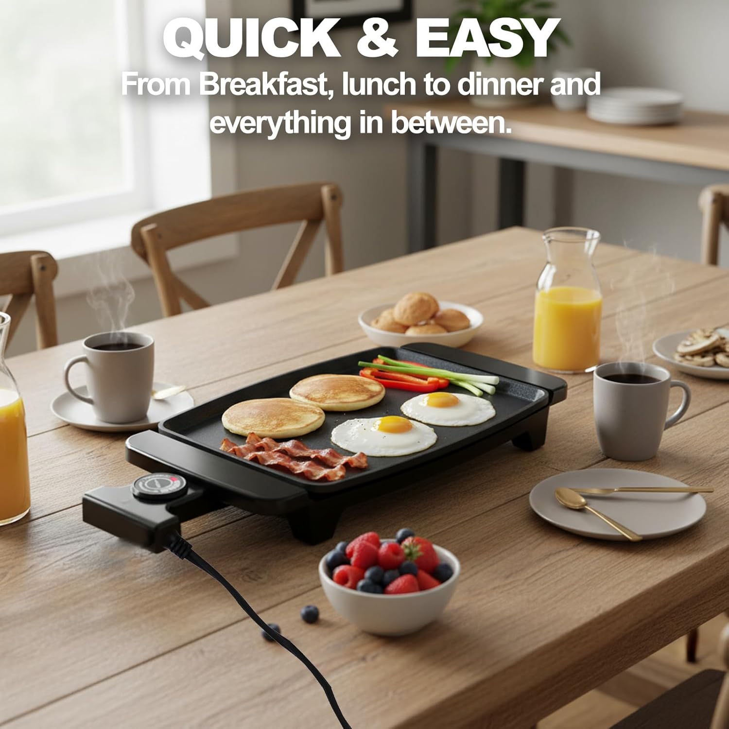 Versatile Cooking: From pancakes, French toast, and eggs to bacon, sausages, burgers, grilled cheese, quesadillas, stir-fried veggies, tofu, and more—cook breakfast, lunch, and dinner effortlessly with just one versatile electric griddle