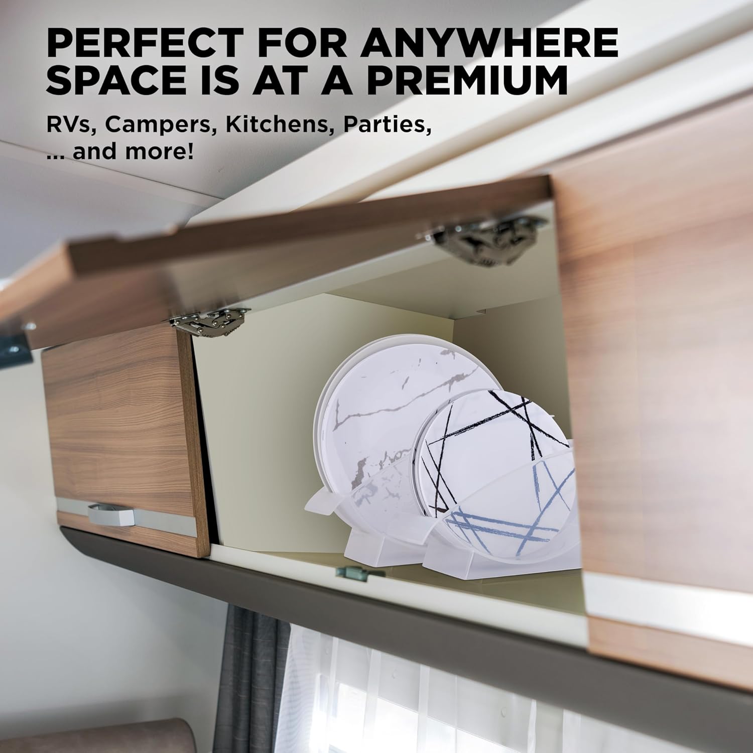 Organizers stand plates upright to make most out of every crevice of cabinet space. Securely stores up to 6 dinner plates. Perfect for sink side drying and buffet self service too! Dishwasher Safe. By Jumbl.