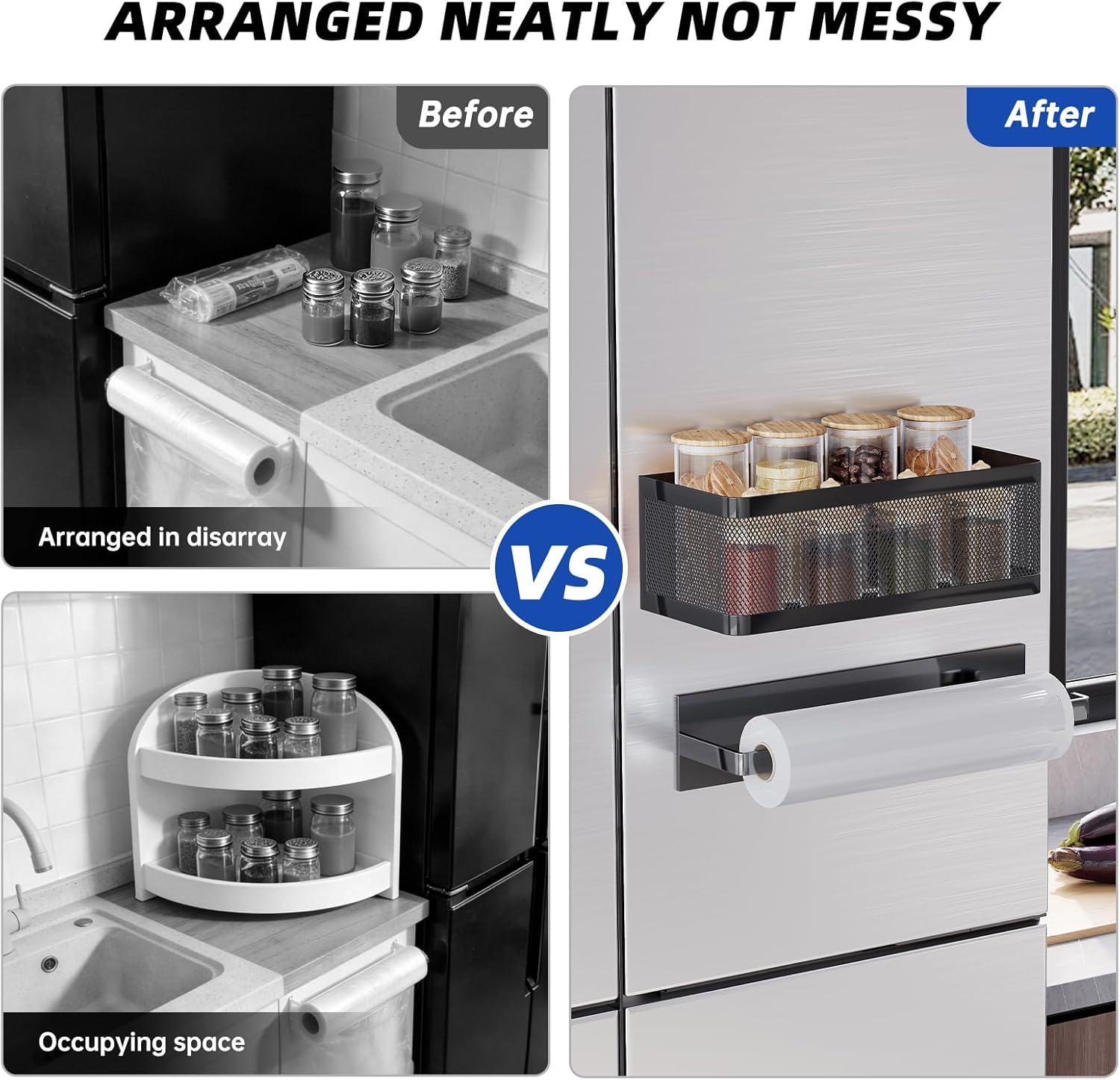 【Detachable Two-Piece Magnetic Design】Unlike bulky fixed racks, our separable design offers flexible usage options. The spice basket and magnetic paper towel holder can be combined together or used separately, allowing you to adjust the layout to suit your height needs. This practical design not only offers convenience but also looks more streamlined and modern on your refrigerator side.
