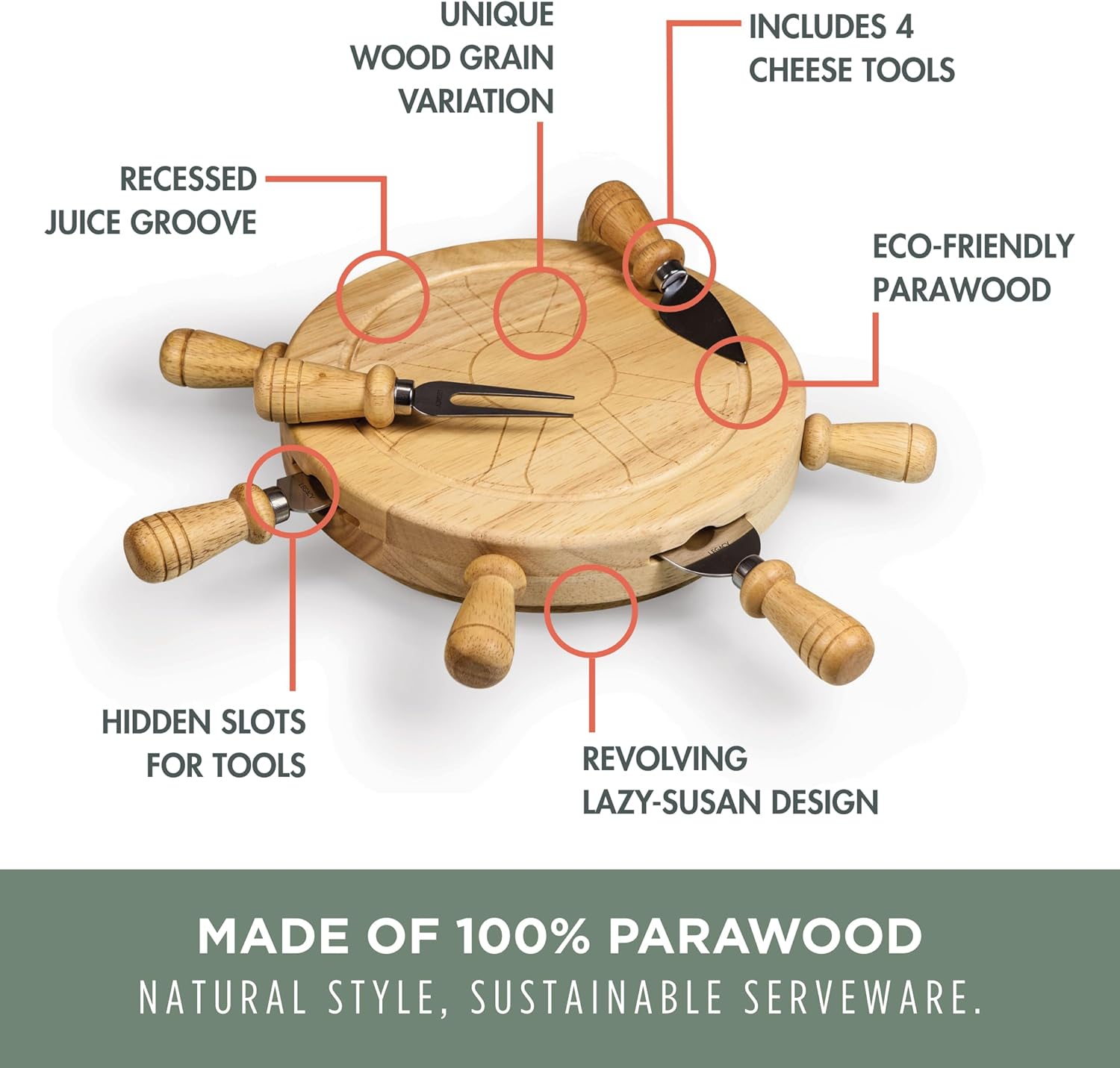 Revolving Tool Access: This revolving cheese board gives everyone easy access to the cutting board top and tools. The tools fit snugly into magnetic slots around the side of the board.