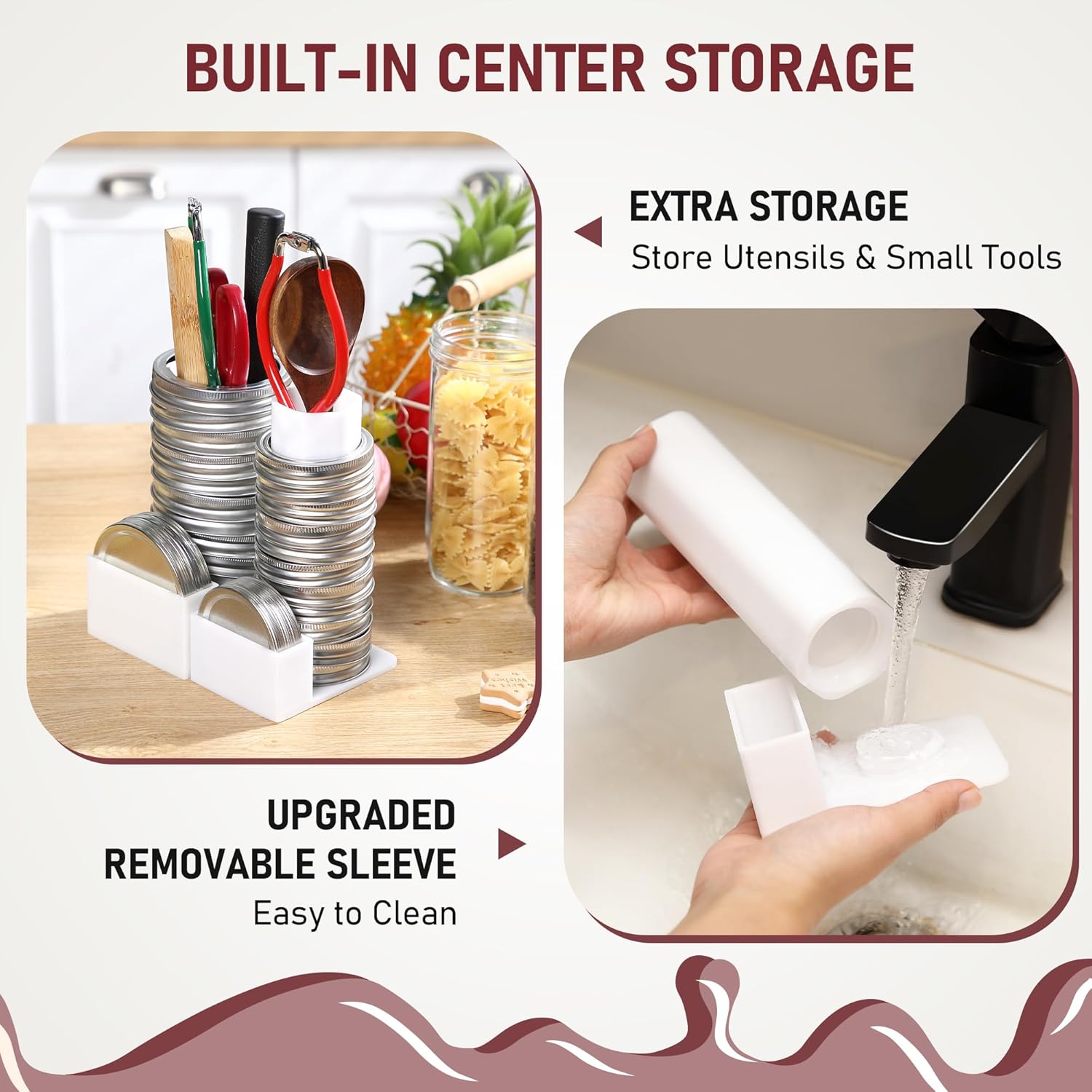 Upgraded Removable Sleeve for Easy, No Dead Corner Cleaning: Our improved center sleeve detaches completely, allowing you to directly reach and wipe both the inner tube and the inside of the organizer—eliminating the hidden spots where dust, residue, and moisture typically build up. Unlike fixed core lid organizers that are difficult to clean inside, this removable design makes routine maintenance quick, thorough, and more hygienic for everyday canning use