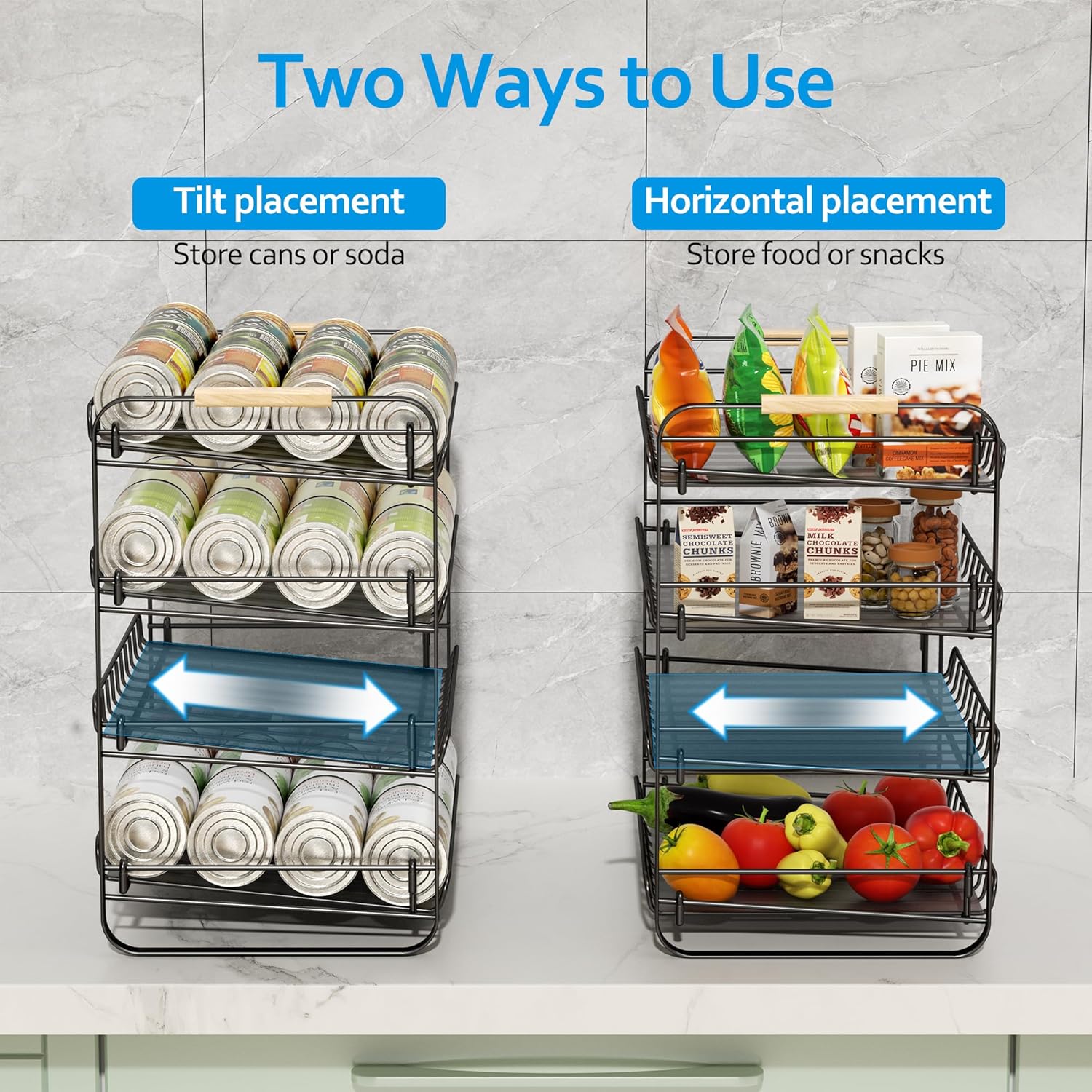 Multi-Functional Storage: This smart dual-mode can holder is designed with adjustable angle on the side, switching between tilting mode (cans roll automatically) or horizontal mode (fruit and vegetable/seasoning bottles are stably stored) in one click, easily adapting to kitchen, countertops, RV and other scenarios. It’s a great way to organize your home’s canned goods, fruits and vegetables