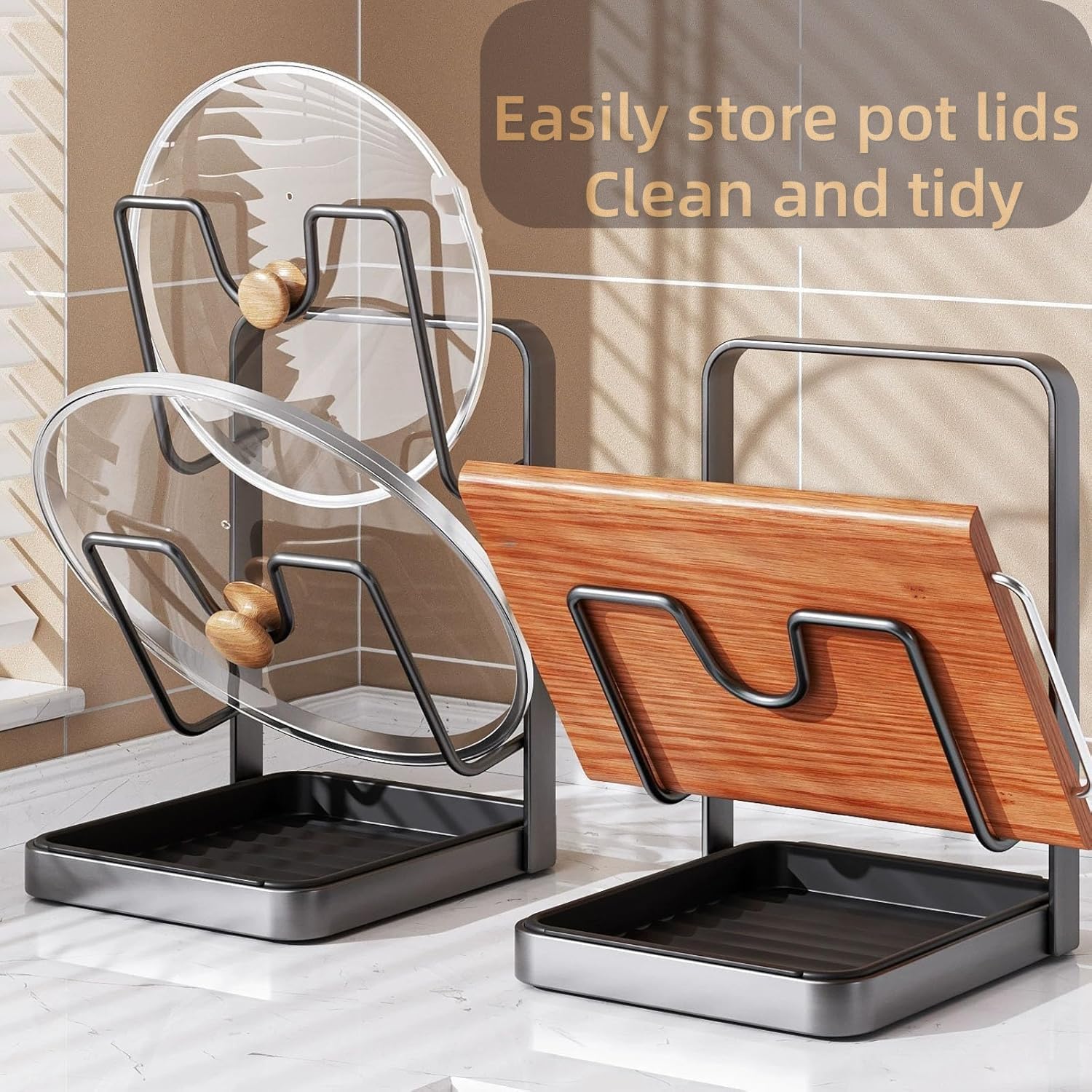 End cabinet chaos with this upright pot lid holder:Our U-shaped slots keep lids vertically organized like books on a shelf—no more slipping, stacking, or searching. It’s the space-saving storage rack that maximizes your countertop or cabinet efficiently.