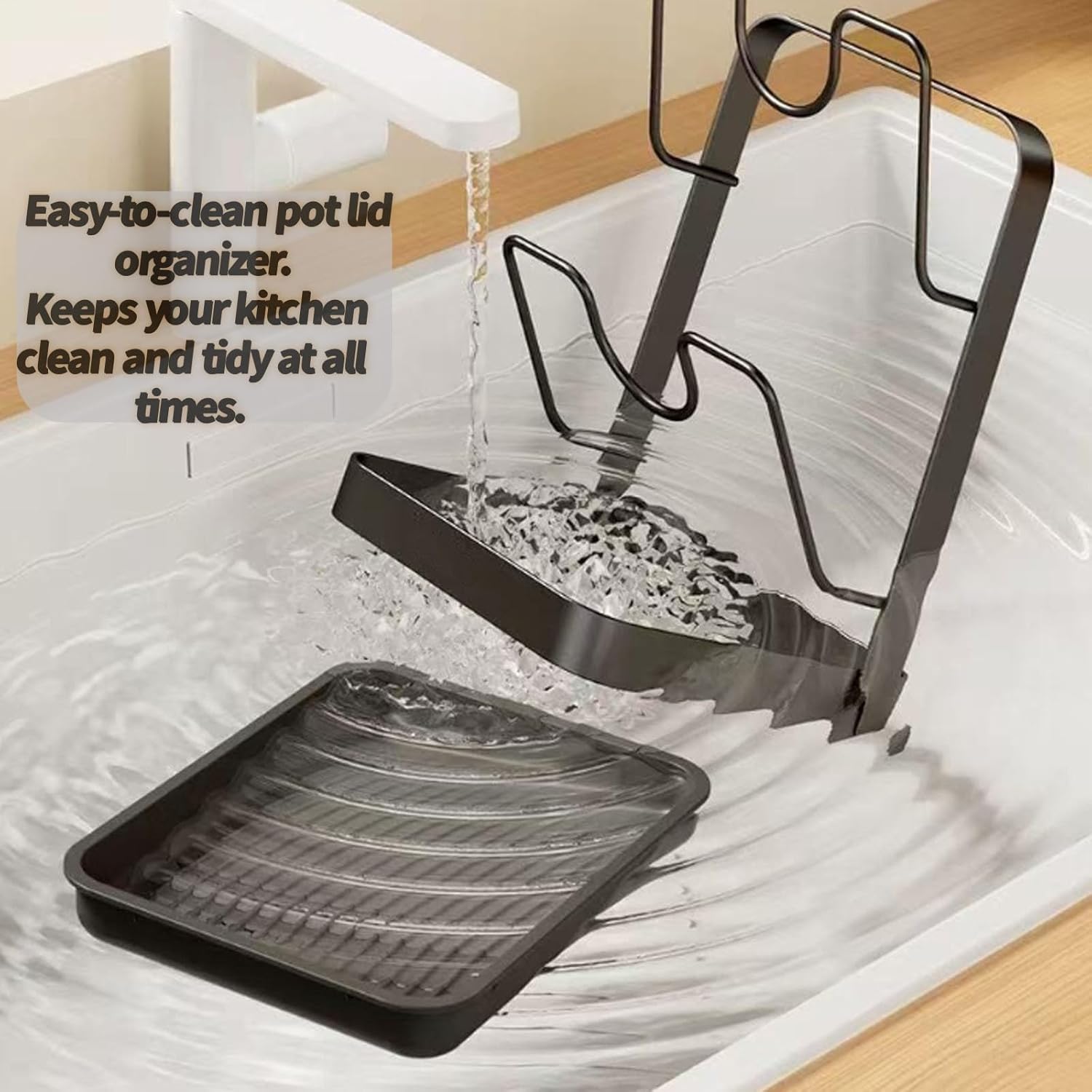 End cabinet chaos with this upright pot lid holder:Our U-shaped slots keep lids vertically organized like books on a shelf—no more slipping, stacking, or searching. It’s the space-saving storage rack that maximizes your countertop or cabinet efficiently.