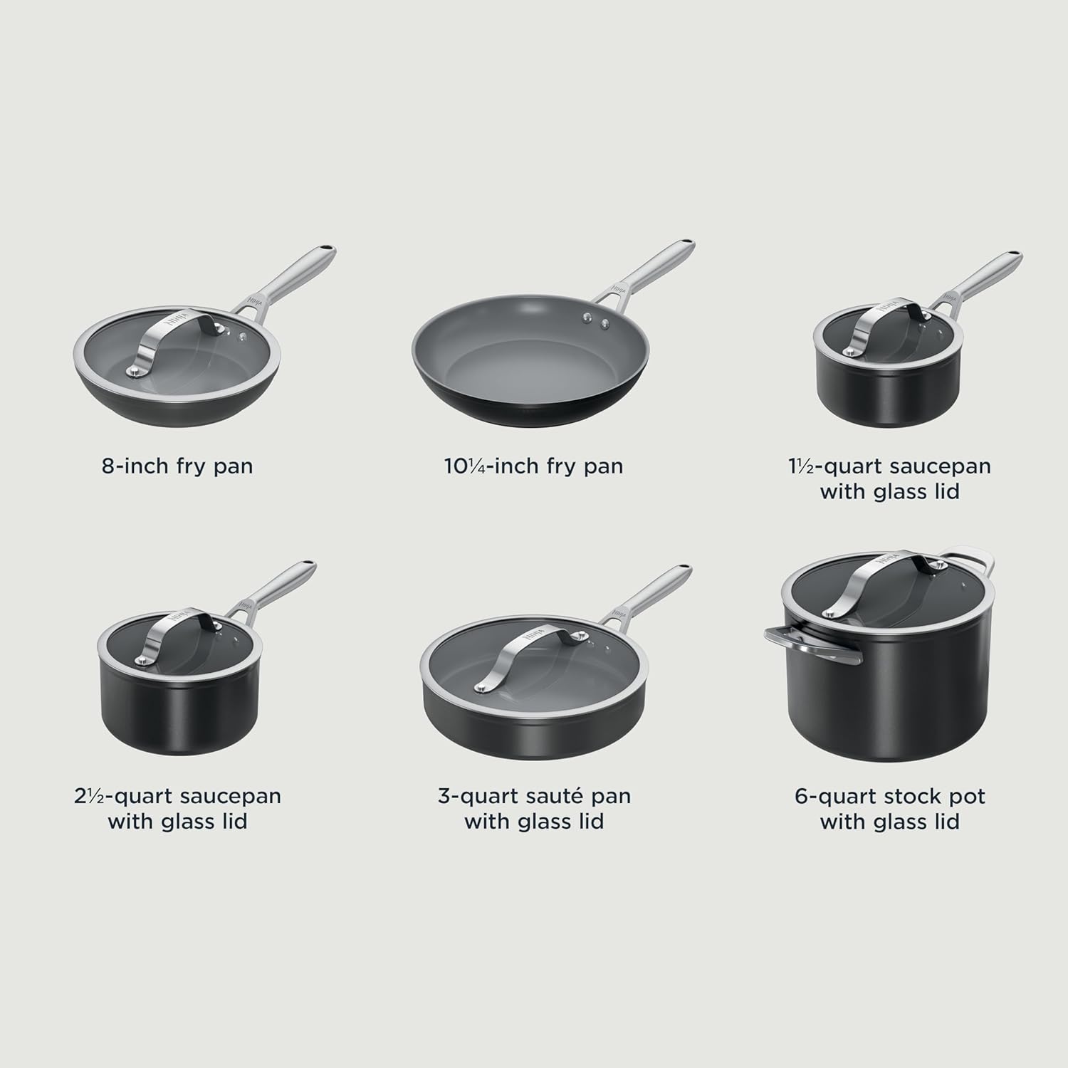 What’s in the box: 8″ Fry Pan with Lid, 10.25″ Fry Pan, 1.5qt Saucepan with Lid, 2.5qt Saucepan with Lid, 3qt Sauté Pan with Lid, 6qt Stock Pot with Lid and User/Recipe Guide.
