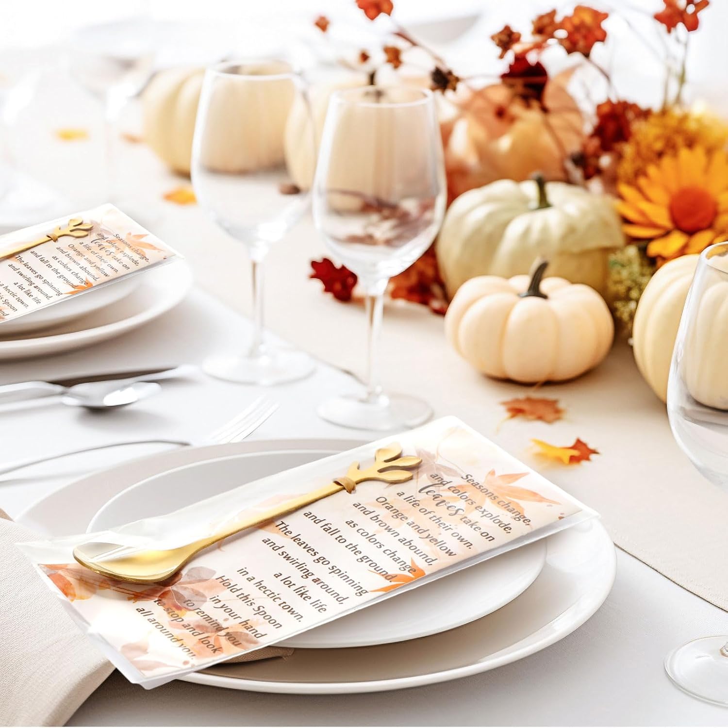 Assorted Fall Party Guest Gifts: teaspoon gift set that include 50 gold dessert spoons, matching 50 thank you cards, 50 opp self-adhesive bags and 50 kraft paper ties for wrapping; This collection ensures a charming, unforgettable experience for your guests; Ideal for fall baby shower party, fall Thanksgiving parties, bridal shower parties, wedding parties, autumn harvest parties, tea parties, and fall themed events