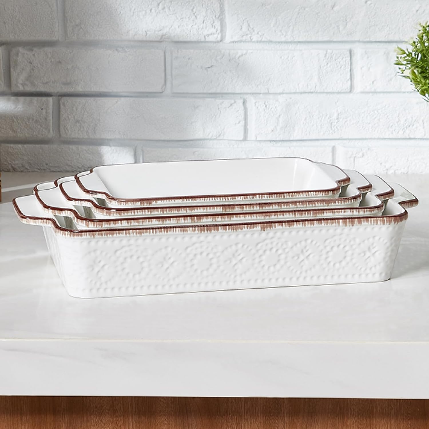 Unique and Gorgeous Casserole Dishes: These ceramic casserole dishes are decorated with exquisite embossed patterns, the concave and convex texture is more layered, the brown hand-painted edges, and the elegant retro tones add a touch of color to your kitchen. Our casserole dish set is suitable for a variety of dishes including lasagna, casserole, bread, pasta, chicken, roast, beef, vegetables, fruit pie, etc. They can be used for heating and storing food, can meet your personal and family needs