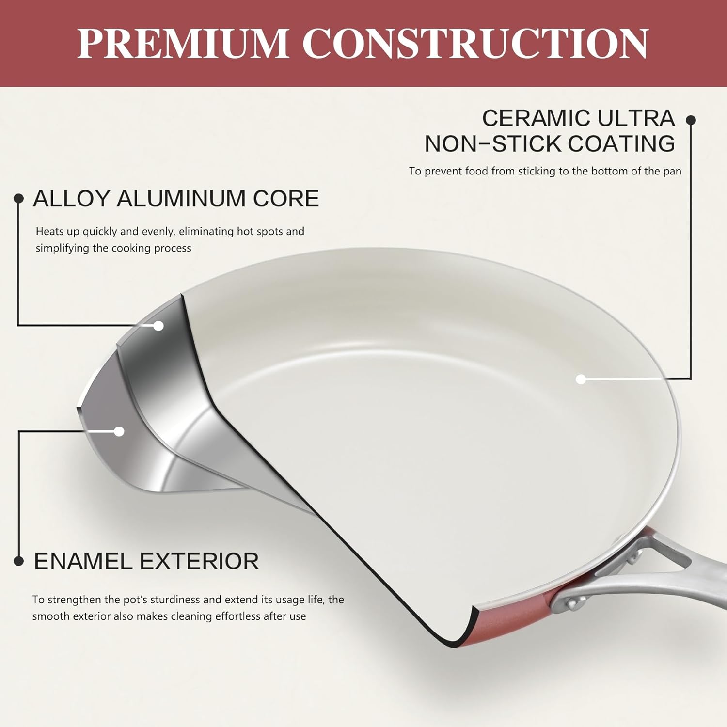 Consistent Heat Distribution: The middle layer of our ceramic cookware is made from durable yet lightweight alloy aluminum. It heats up quickly and evenly, eliminating hot spots and simplifying the cooking process. Usage Tip: For best results, use low to medium heat. The inner ceramic coating and outer enamel material make cleanup a breeze after cooking
