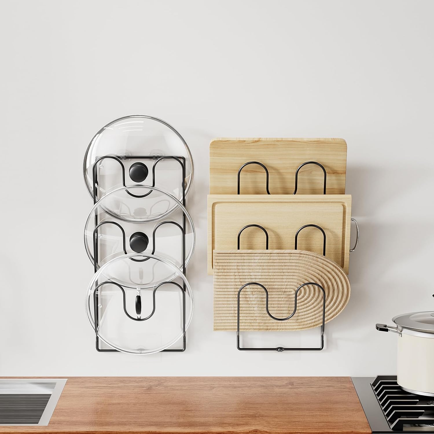 Durable & Scratch-Resistant: Made of high-quality steel with sleek black powder coating, this pot cover rack resists rust, bending and scratches. Sturdy for long use, its smooth surface protects lids from damage. Use as pan lid organizers inside cabinets for tidy storage or as a wall mount pot cover holder near stoves for quick access