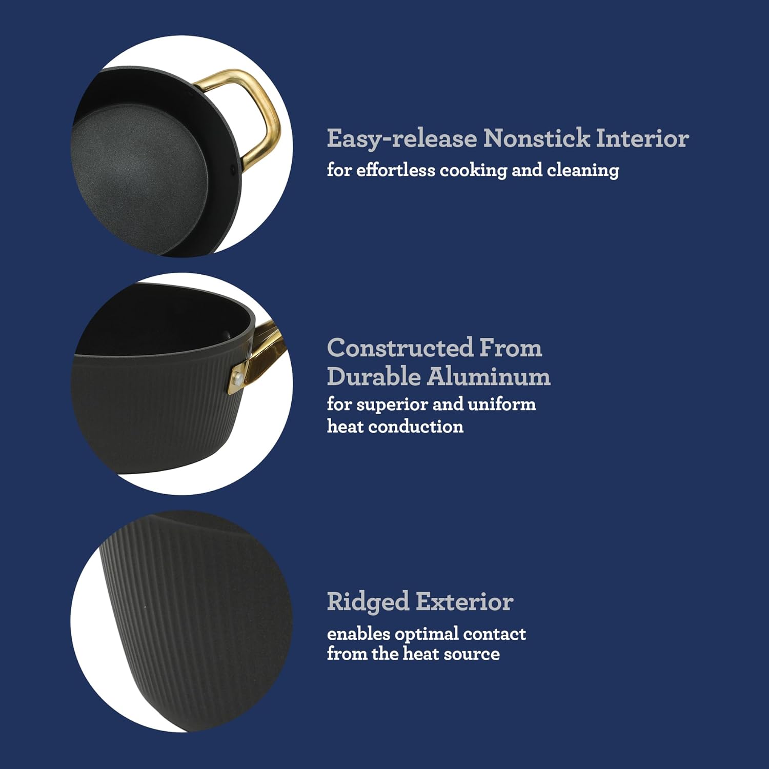 SUPERIOR HEAT CONDUCTION: Durable aluminum construction conducts heat evenly throughout the cookware to turn fresh ingredients into delicious meals. Ridged exterior adds a modern design detail to each piece.