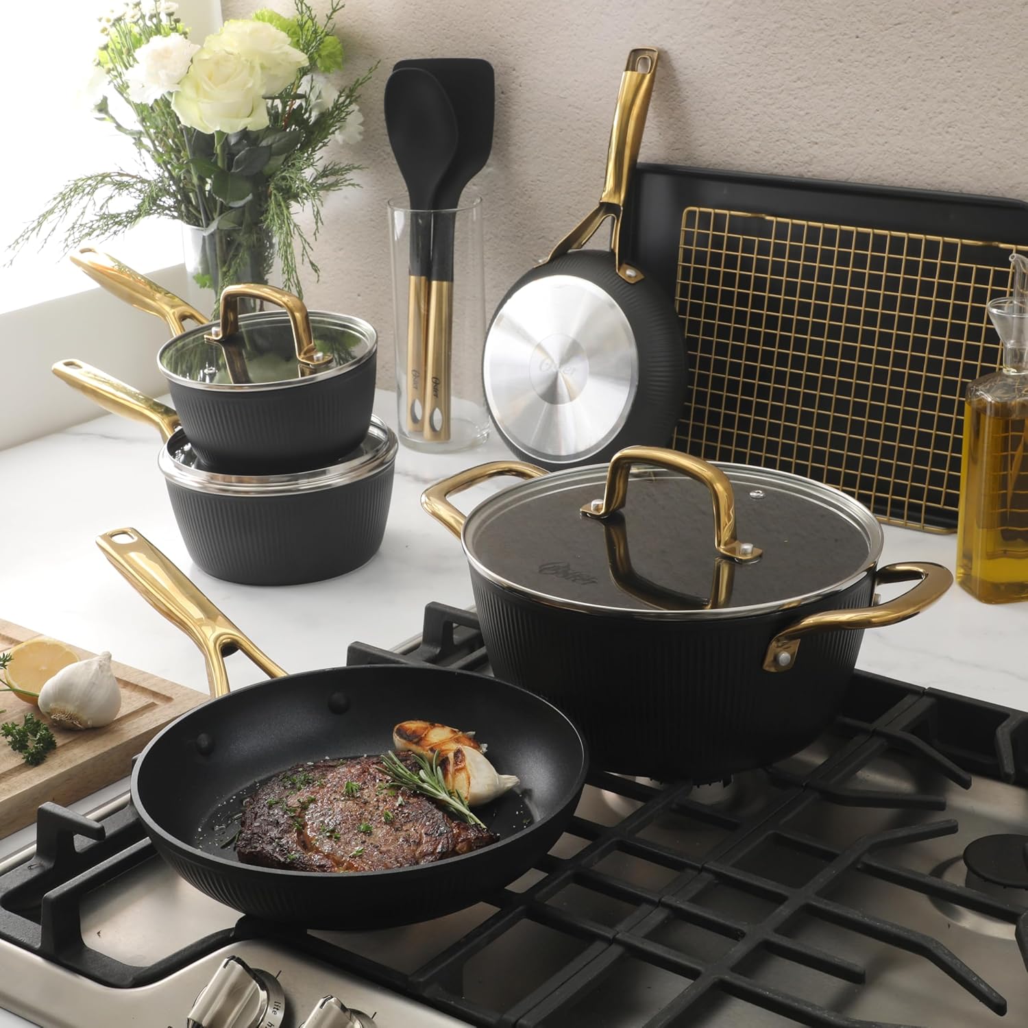 A COMPLETE SET INCLUDES: Two frying pans (8 inches and 9.5 inches), two saucepans with lids (1.3 quarts and 1.9 quarts), one 4.4-quart Dutch oven with lid, one 15-inch cookie sheet, one 13.5-inch cooling rack, one nylon turner, one nylon spoon and four washable felt pads (8 inches, 10 inches and 12 inches) from the Oster Platinum Collection