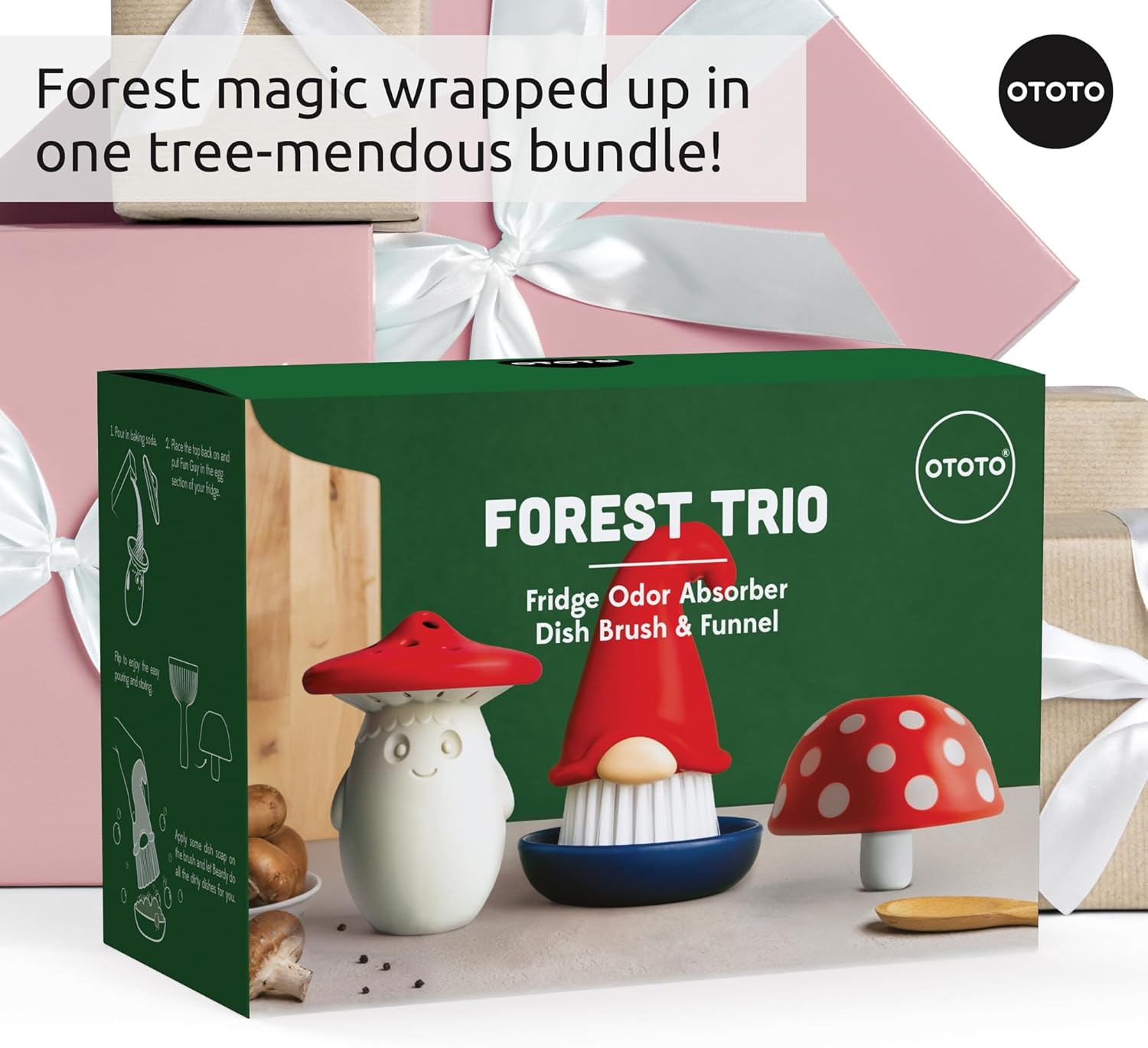 Scrub, Funnel, and Freshen Up! – Beardy tackles tough grime with sturdy bristles, Magic Mushroom makes pouring a no-spill thrill, and Fun Guy keeps your fridge smelling fresh. Together, these gnomes and mushrooms are cute kitchen accessories that actually work!