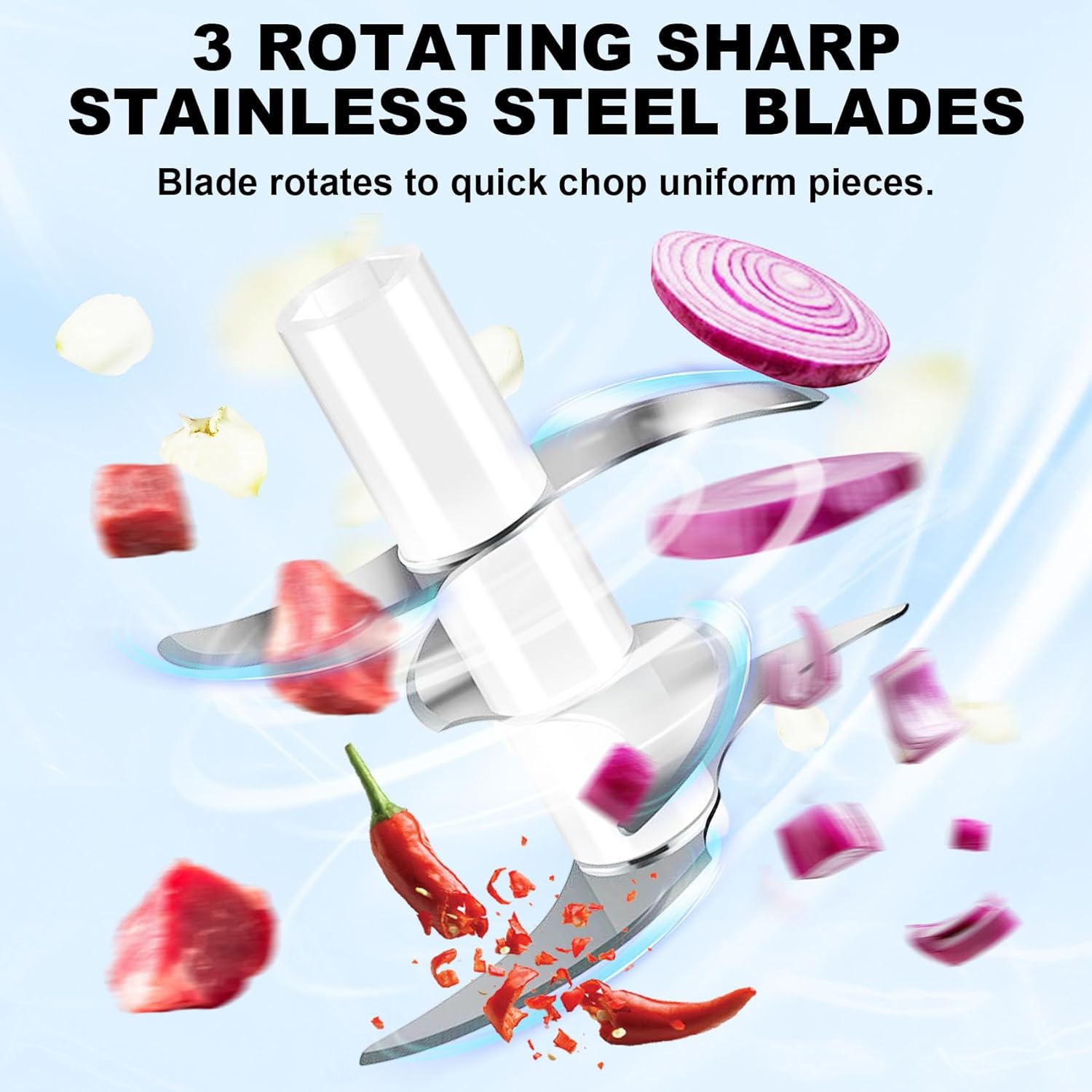 Powerful 6-Blade Chopping Performance: This electric garlic chopper features 6 sharp stainless steel blades that effortlessly mince garlic, chop veggies, and grind spices in seconds—turning it into a top-tier garlic mincer electric for daily use. Whether you need fine garlic bits or chopped herbs, it delivers restaurant-quality results with minimal effort, outperforming ordinary small electric chopper models