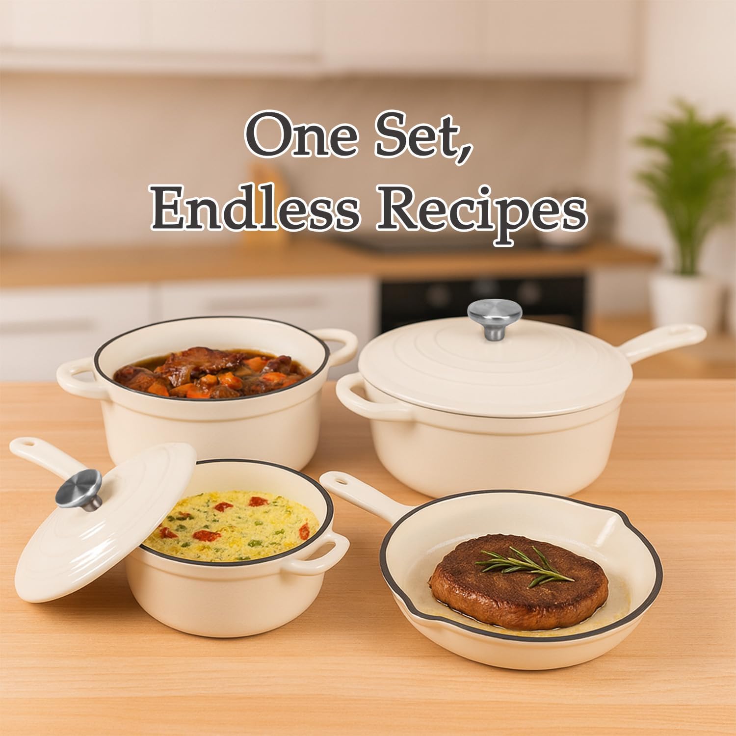 【What You Get?】This enameled cast iron cookware set includes everything you need for versatile cooking. It comes with a 2.3QT Dutch oven with lid for slow-cooking roasts, soups, and bread, a 2QT saucepan with lid perfect for sauces or warming oatmeal, a 3.5QT deep skillet for sautéing and frying, and a 10.25” skillet ideal for omelets, pancakes, and family meals. A convenient cookware rack is also included to keep your kitchen organized and tidy, making cooking and storage effortless.